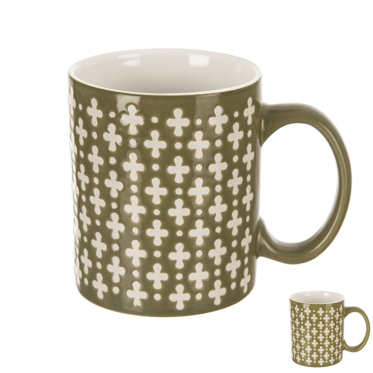 Kód produktu 129615Keramický hrnček s objemom 0,35 l s motívom krížov a glazúrou v tlmenej zelenej farbe.
