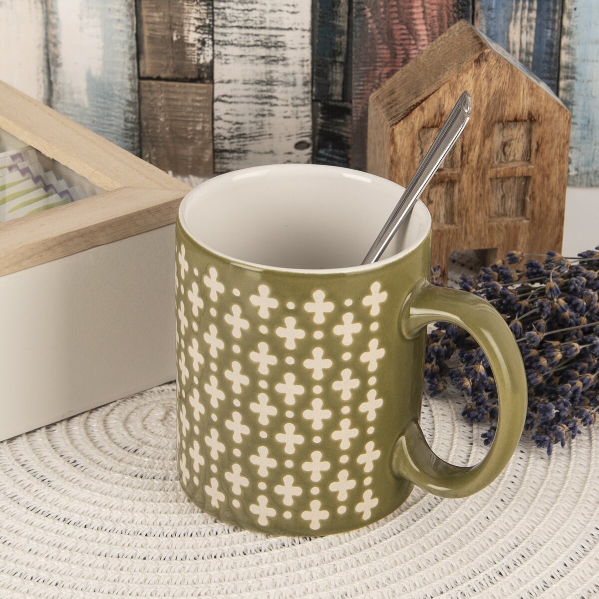 Obľúbený čaj, horúcu kávu alebo iný nápoj si vychutnáte v keramickom hrnčeku v tlmenej zelenej farbe, ktorý je plošne zdobený motívom drobných krížikov, ktoré priznávajú surový keramický povrch.