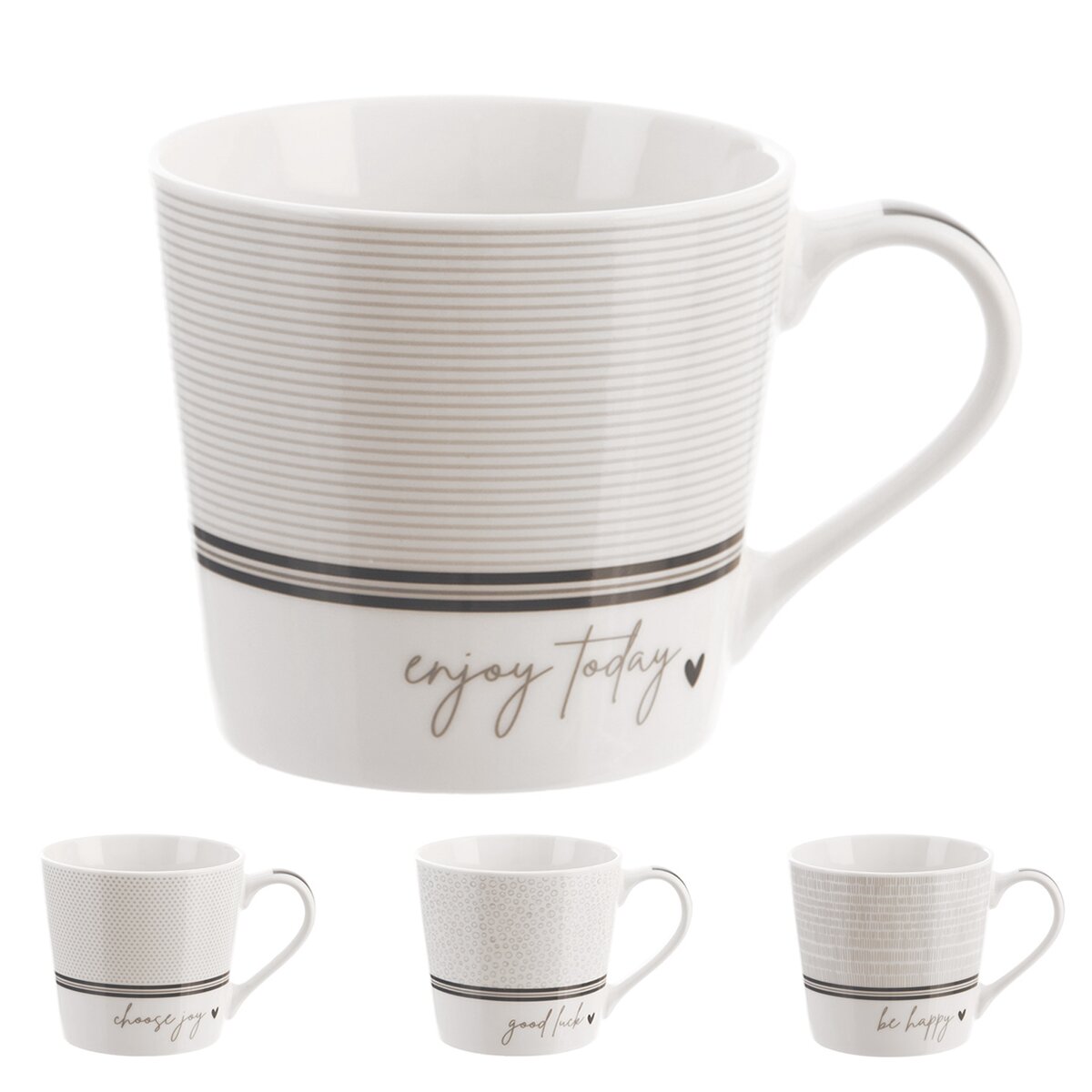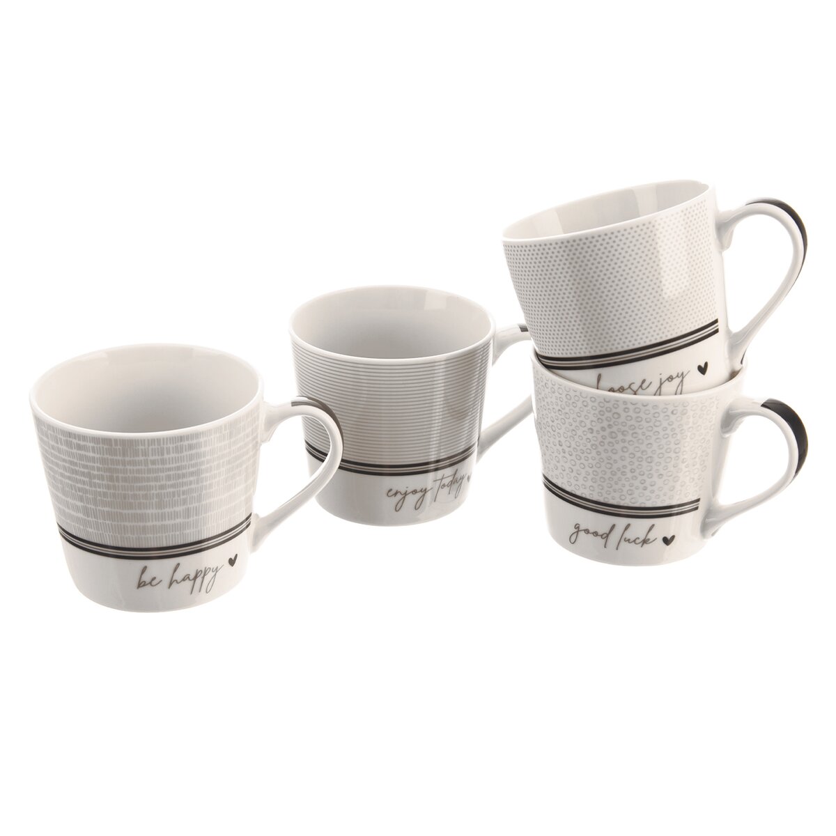 Kód produktu 129436Porcelánový hrnček s objemom 440 ml, s jednoduchou potlačou a anglickými nápismi s prianím šťastia a radosti, je vhodný na servírovanie teplých i studených nápojov. Možno ho použiť v mikrovlnnej rúre aj v umývačke.
