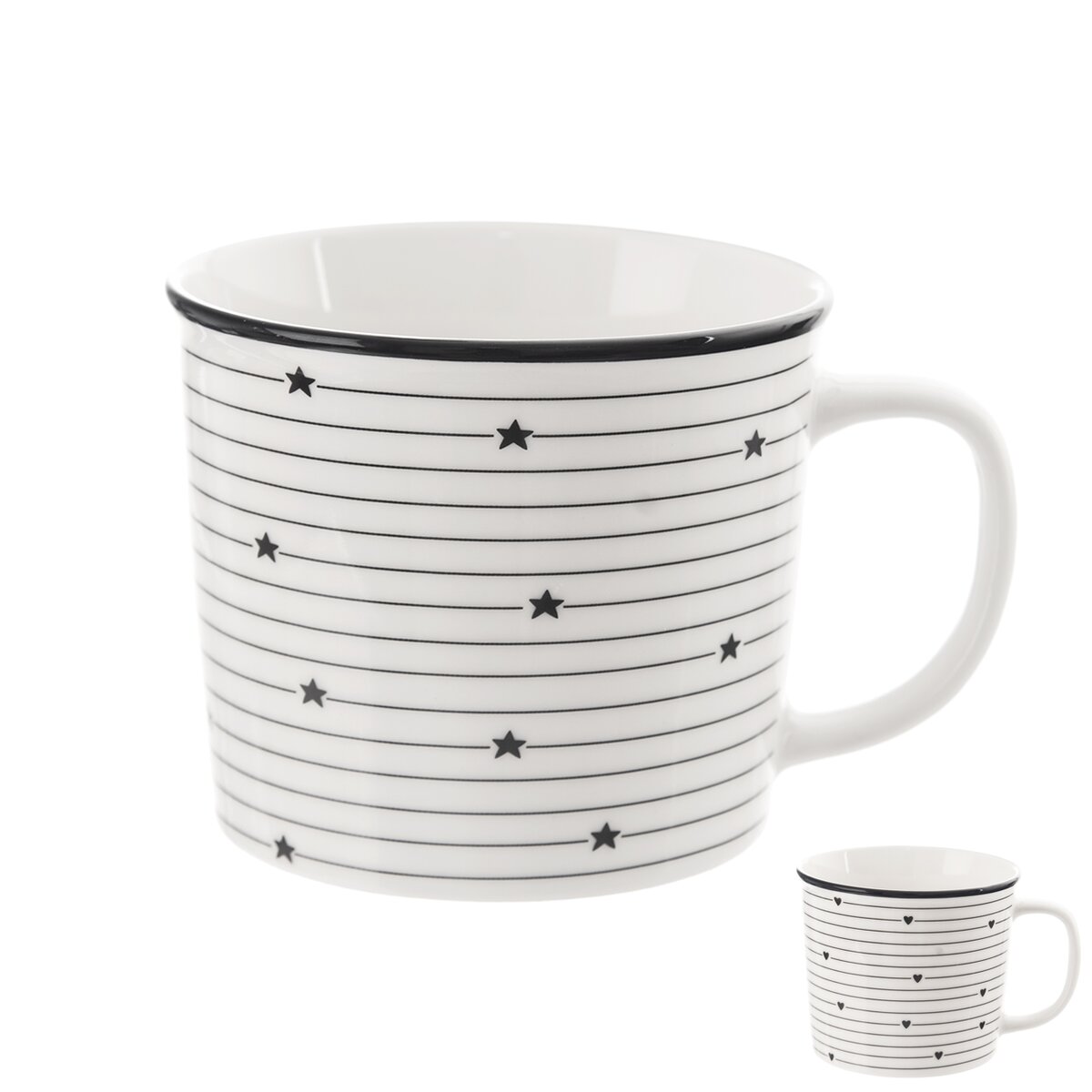 Kód produktu 128874Bielo porcelánový hrnček s objemom 0,38 l s motívom liniek a drobných čiernych srdiečok alebo hviezdičiek.