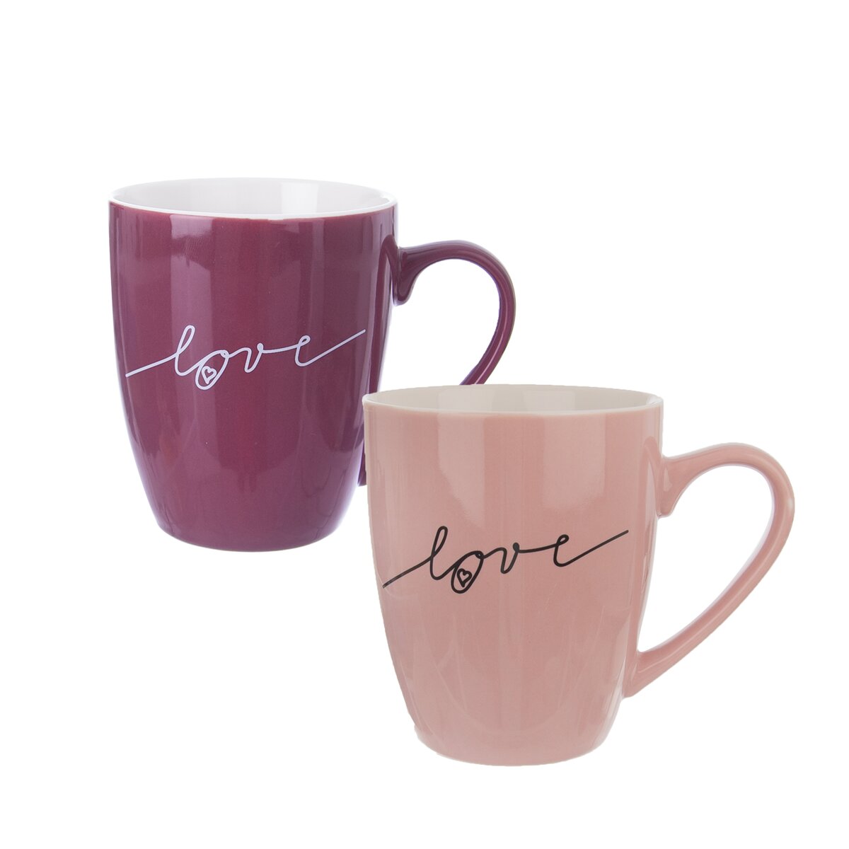 Kód produktu 128825Sada dvoch porcelánových hrnčekov s objemom 0,38 l s nápisom LOVE vo fialovej a lososovej farbe.