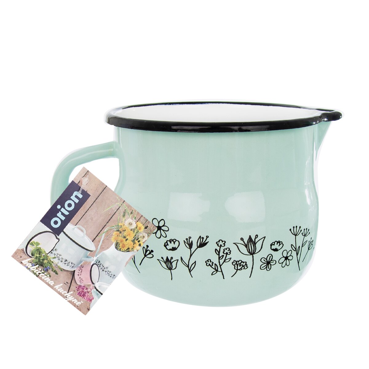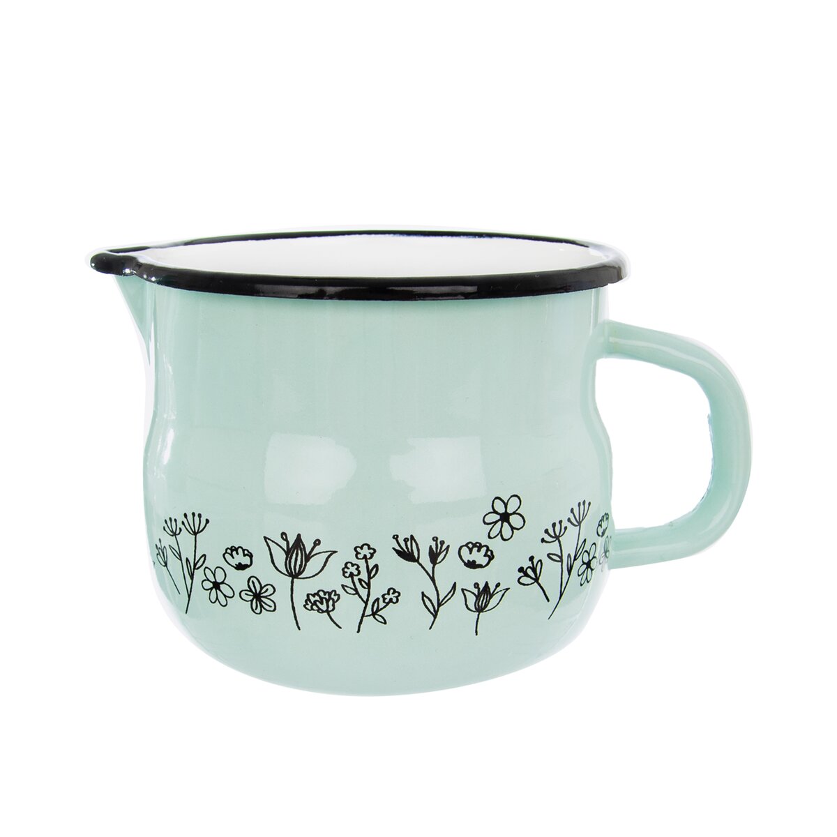 Baňatý smaltovaný hrnček LÚKA s praktickou výlevkou môžete použiť na ohrev mlieka alebo ako džbán na vodu.