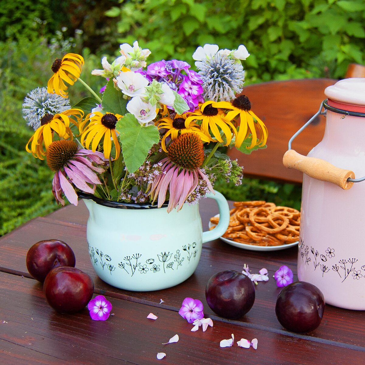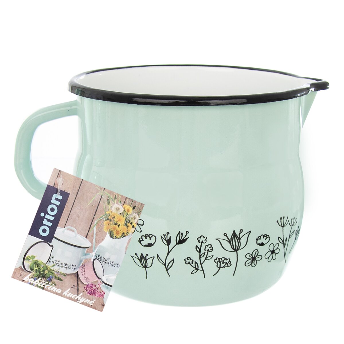 Baňatý smaltovaný hrnček LÚKA s praktickou výlevkou môžete použiť na ohrev mlieka alebo ako džbán na vodu.