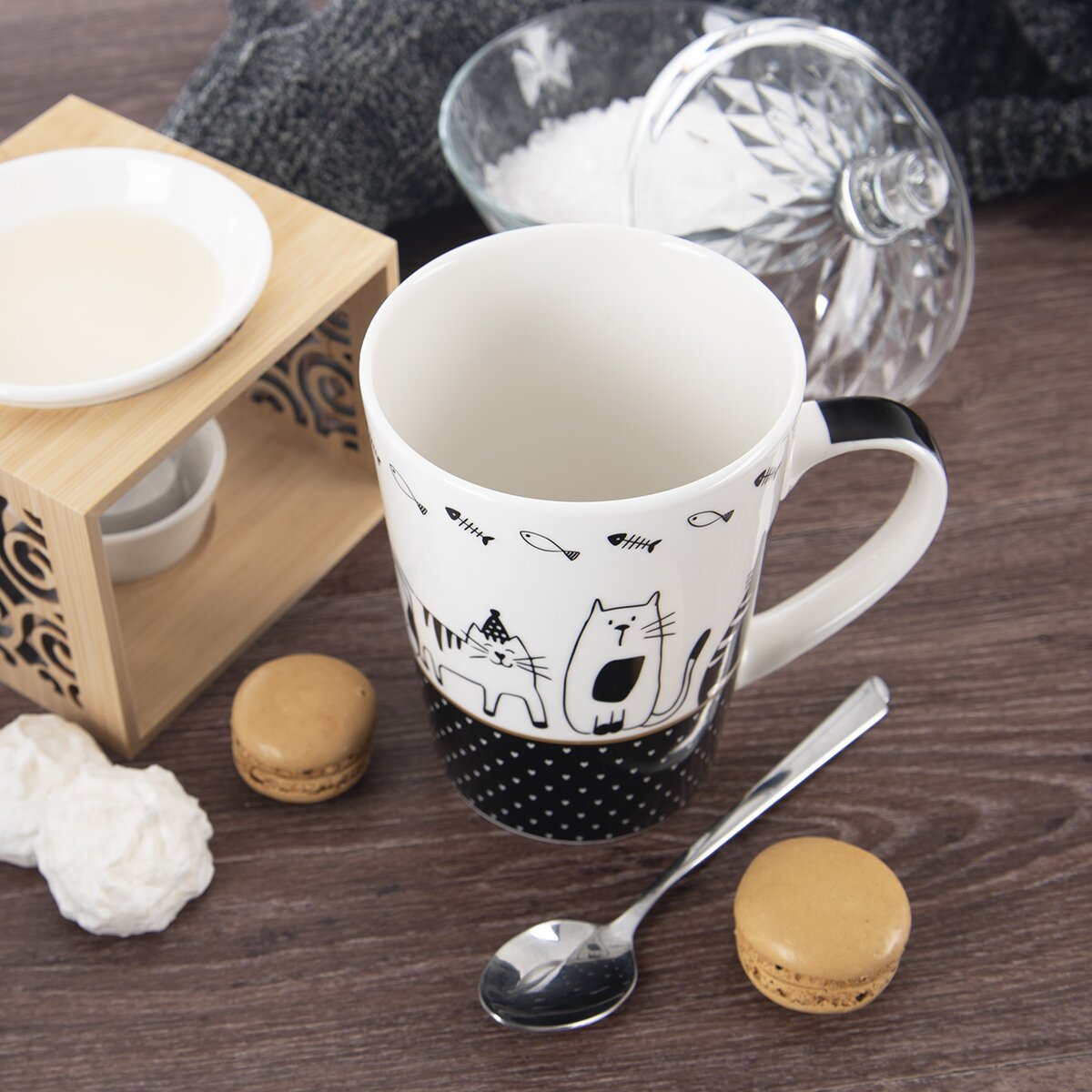 Viac informáciíBiely porcelánový hrnček, kombinujúci čiernu kresbu roztomilých zvieratiek a geometrickú spodnú časť, priamo nabáda k príprave horúceho kakaa alebo lahodného čaju. Vďaka objemu 550 ml ho možno použiť aj na prípravu instantnej polievky a ohrevu v mikrovlnnej rúre.