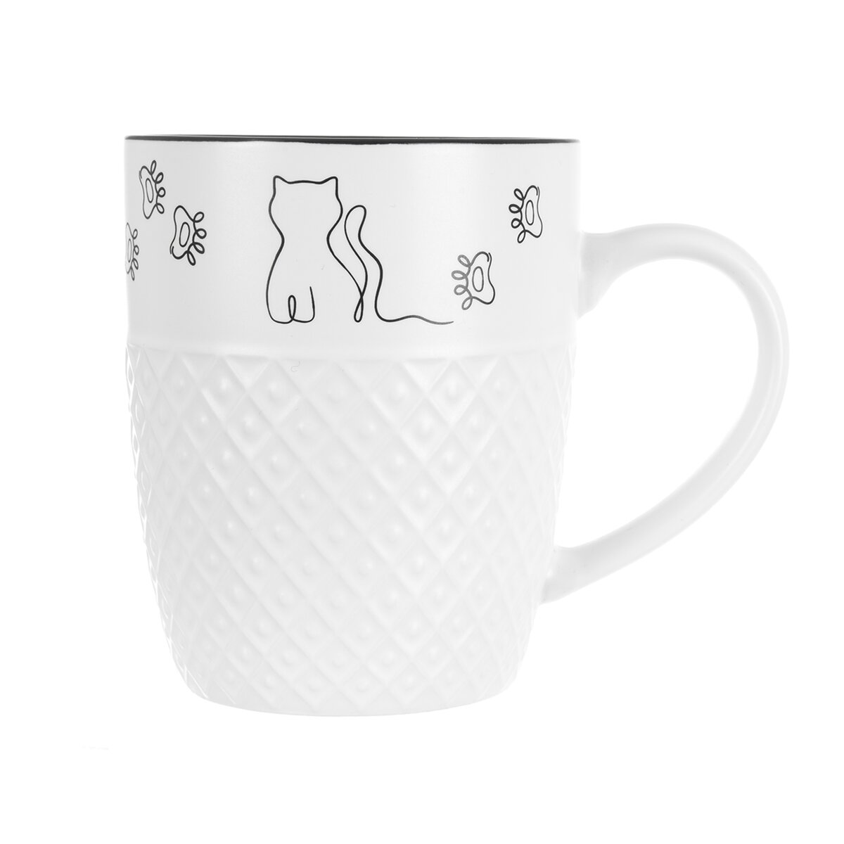 Kód produktu 132220Porcelánový biely tanier MICKA s plastickým reliéfom je zdobený decentným dekorom mačacích stôp a siluetou mačky. Má objem 0,38 l a je určený na podávanie teplých aj studených nápojov.