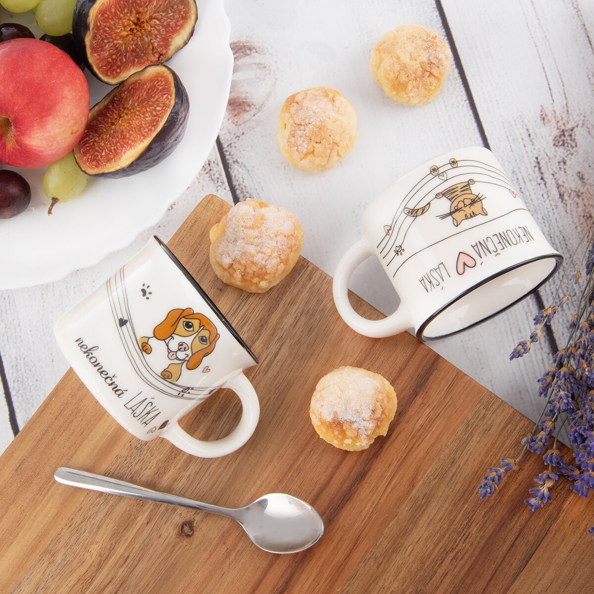 Kód produktu 129463Keramický hrnček s objemom 100 ml zaujme nápisom Nekonečná láska a motívom psíka. Vhodný predovšetkým na podávanie silnej kávy.