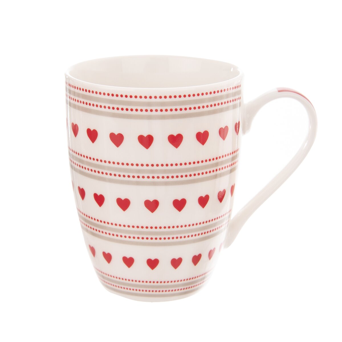 Kód produktu 128804Červený porcelánový hrnček s objemom 0,35 l s dekórom bielych prúžkov a srdiečok.