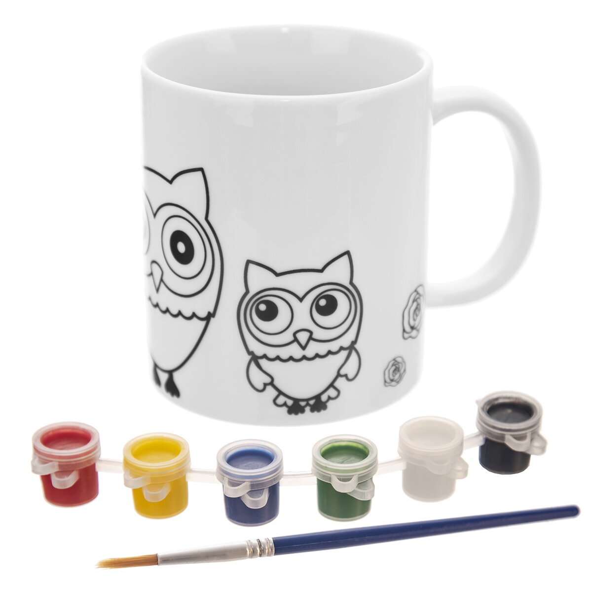 Kód produktu 129439Kreatívna sada bieleho hrnčeka so vzorom sov, s objemom 0,38 l, 1 štetec a 6 farieb na porcelán. Farby sa fixujú zapečením v rúre.