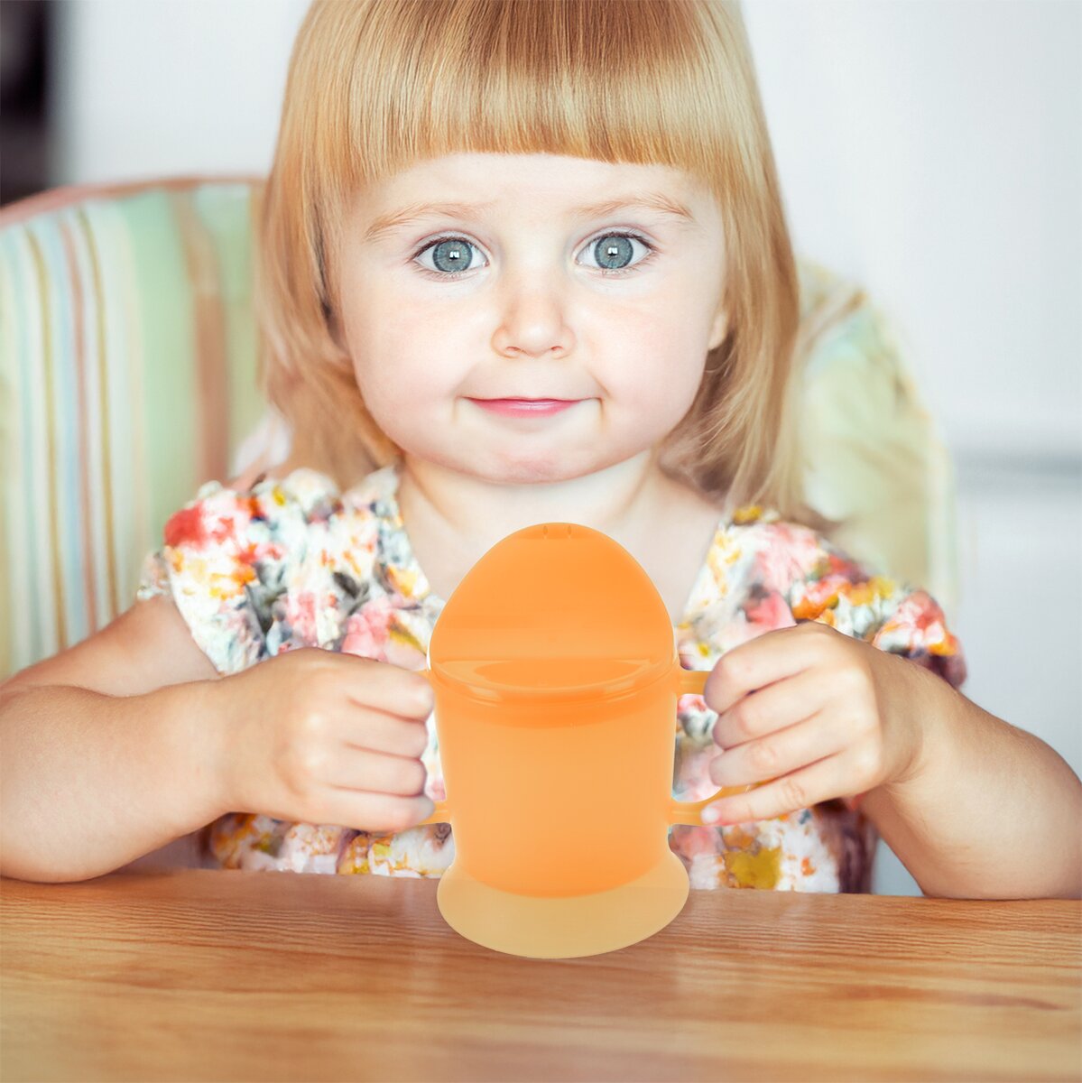 Oranžový plastový hrnček s náustkom s objemom 230 ml neobsahuje BPA, môžu ho tak používať deti od 3 rokov, seniori a osoby s horšou jemnou motorikou. Má praktický náustok s otvormi a po jeho sňatí ho možno ľahko umývať aj v umývačke.