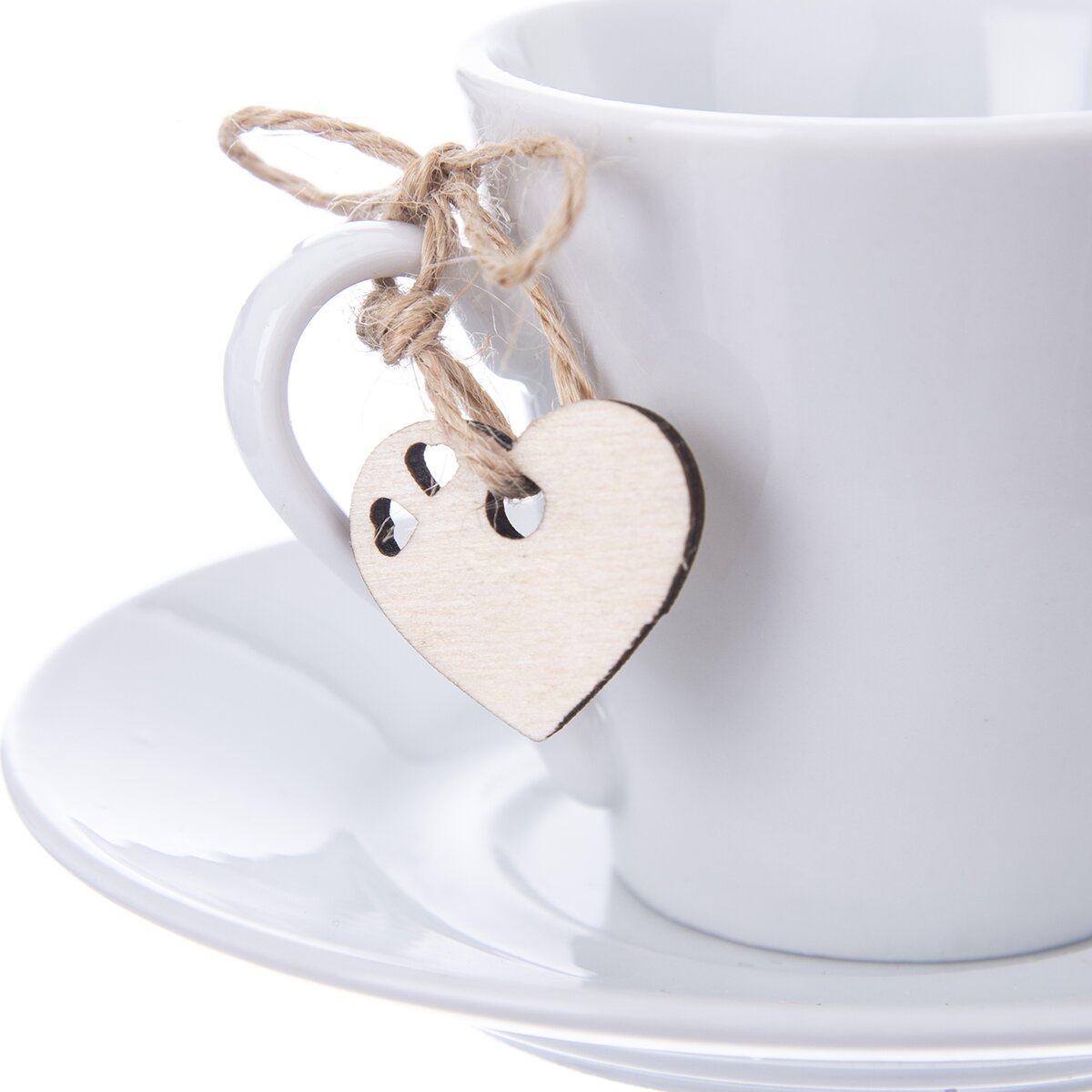 Kód produktu 610828Hrnček s uchom, podšálka a prívesok. Materiál: porcelán, drevo. Farba biela. Rozmery: objem 0,09 l, pr. š. 6 cm, pr. podš. 12 cm, prívesok 2,5x2,5 cm.