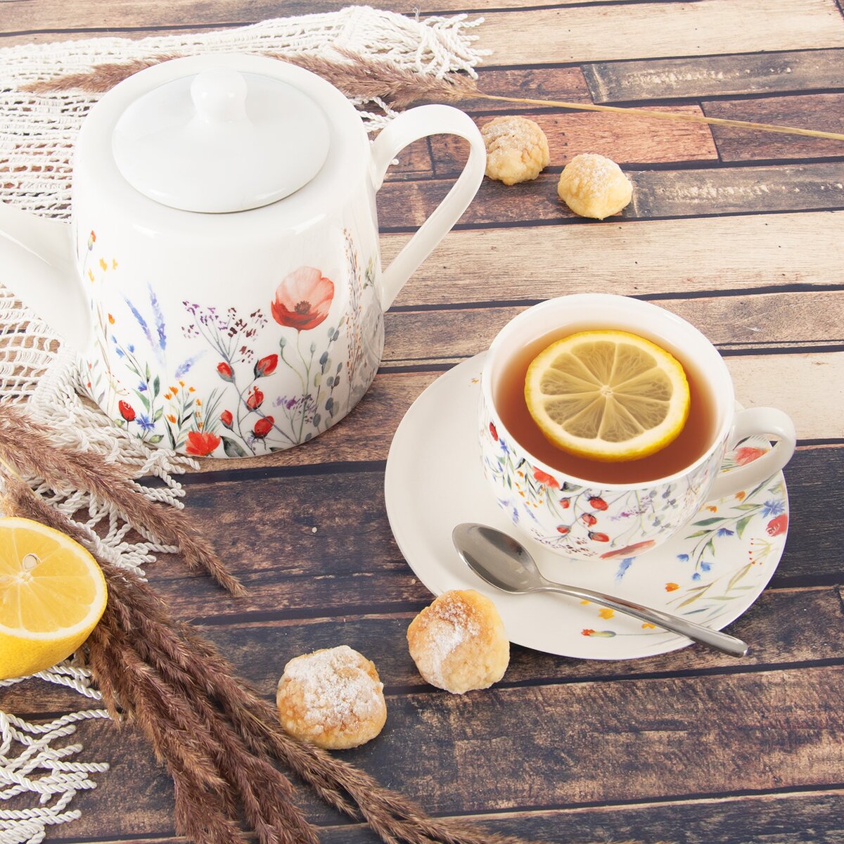 Nežný hrnček je doplnený tanierikom, ktorý poslúži samostatne napr. aj ako dezertný tanierik na domácu bábovku a má priemer 15,5 cm. Urobte si tak pohodovú chvíľku s dobrým sypaným, vreckovým alebo bylinkovým čajom nielen doma, ale aj v obľúbenej kaviarni alebo čajovni.