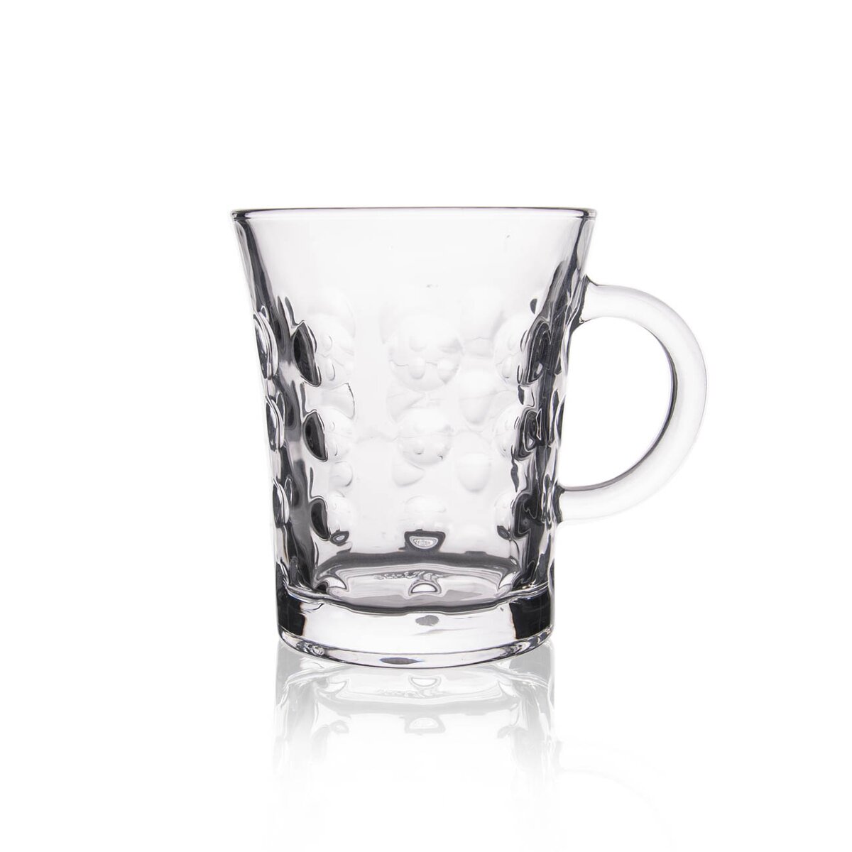 Hrnček s uchom so vzorom. Materiál: sklo. Rozmery: objem 0,28 l, pr. 8,5 cm, v. 10 cm.