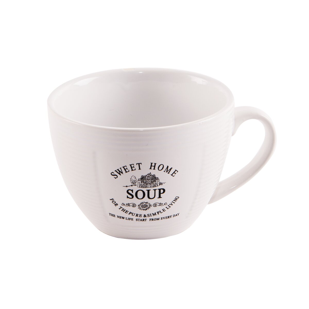 Keramický hrnček určený nielen na polievku, ale aj väčšiu kávu či obľúbený čaj. Elegantná biela farba a jemné vrúbkovanie sú doplnené ladiacim dekorom, ktorý spája produkty z kolekcie SWEET HOME. Hrnček má objem 500 ml.