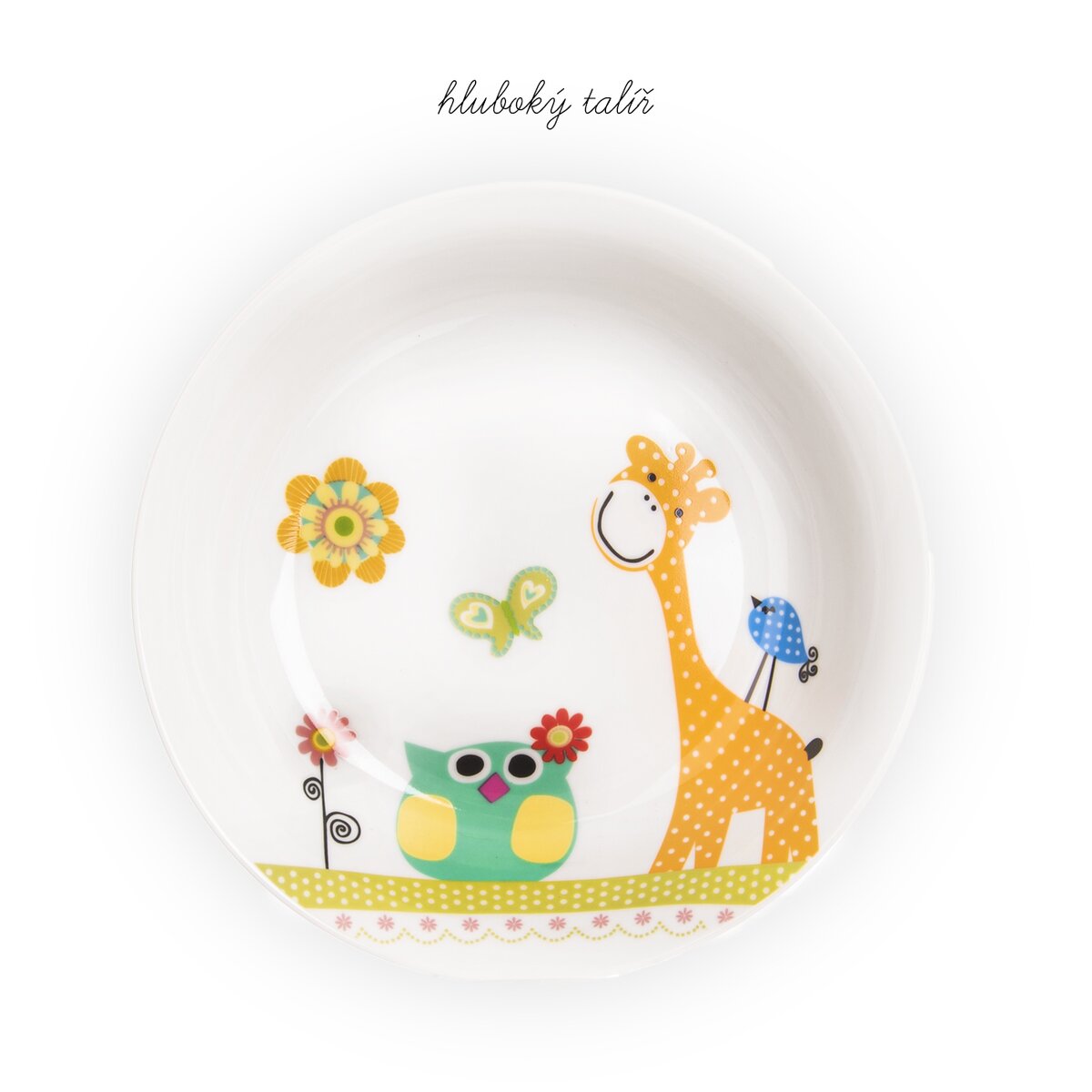 Kód produktu 112340Porcelánová jedálenská sada ŽIRAFA tvorená hrnčekom s objemom 0,225 l, hlbokým tanierom s priemerom 19 cm a plytkým tanierom s priemerom 21 cm.