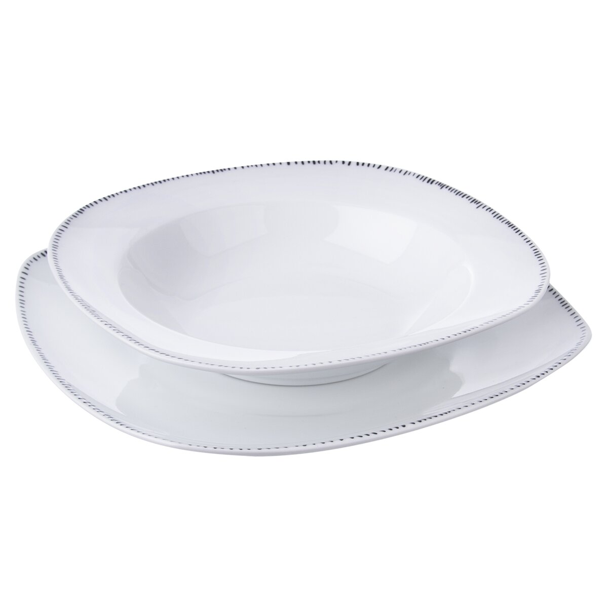 Kód produktu 128457Jedálenská porcelánová sada je tvorená šiestimi hranatými dezertnými, šiestimi hlbokými a šiestimi plytkými taniermi s jemným dekorom čiarok po obvode.