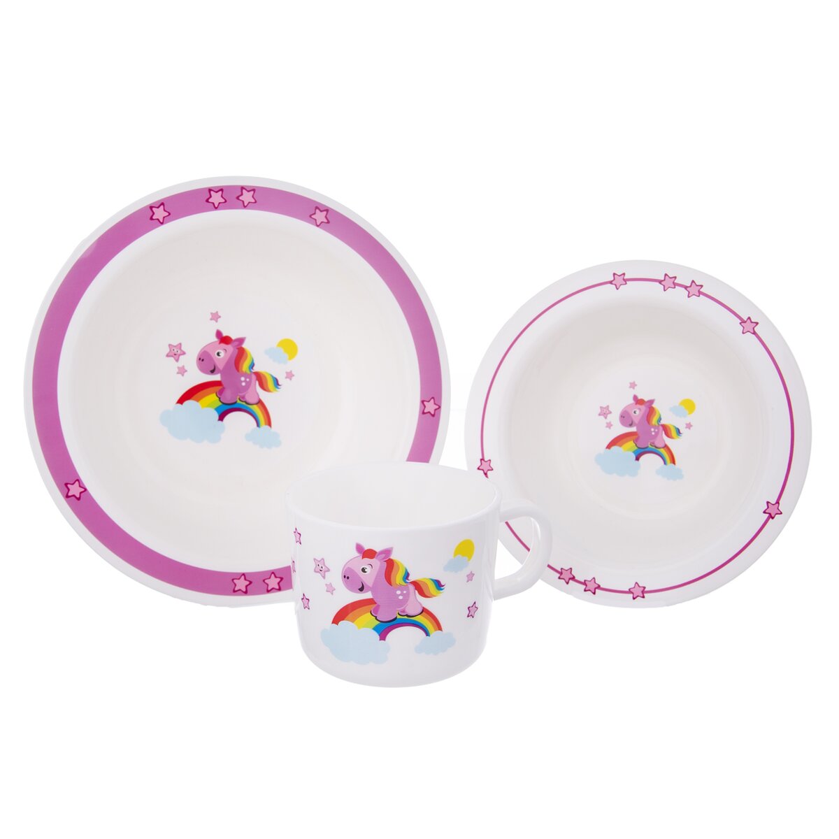 Kód produktu 112348Plastová jedálenská sada KONÍK tvorená hrnčekom s objemom 0,25 l a dvoma hlbokými miskami s priemerom 14 cm a 17,5 cm.