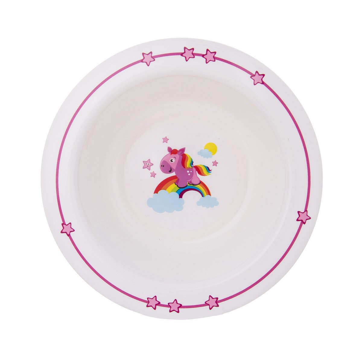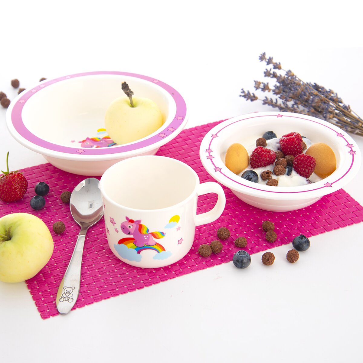 Ružový koník preháňajúci sa po nebesiach. Prečo stojí na dúhe? A kam asi uteká? Táto nebeská jedálenská sada zaujme pozornosť nejedného malého stravníka.