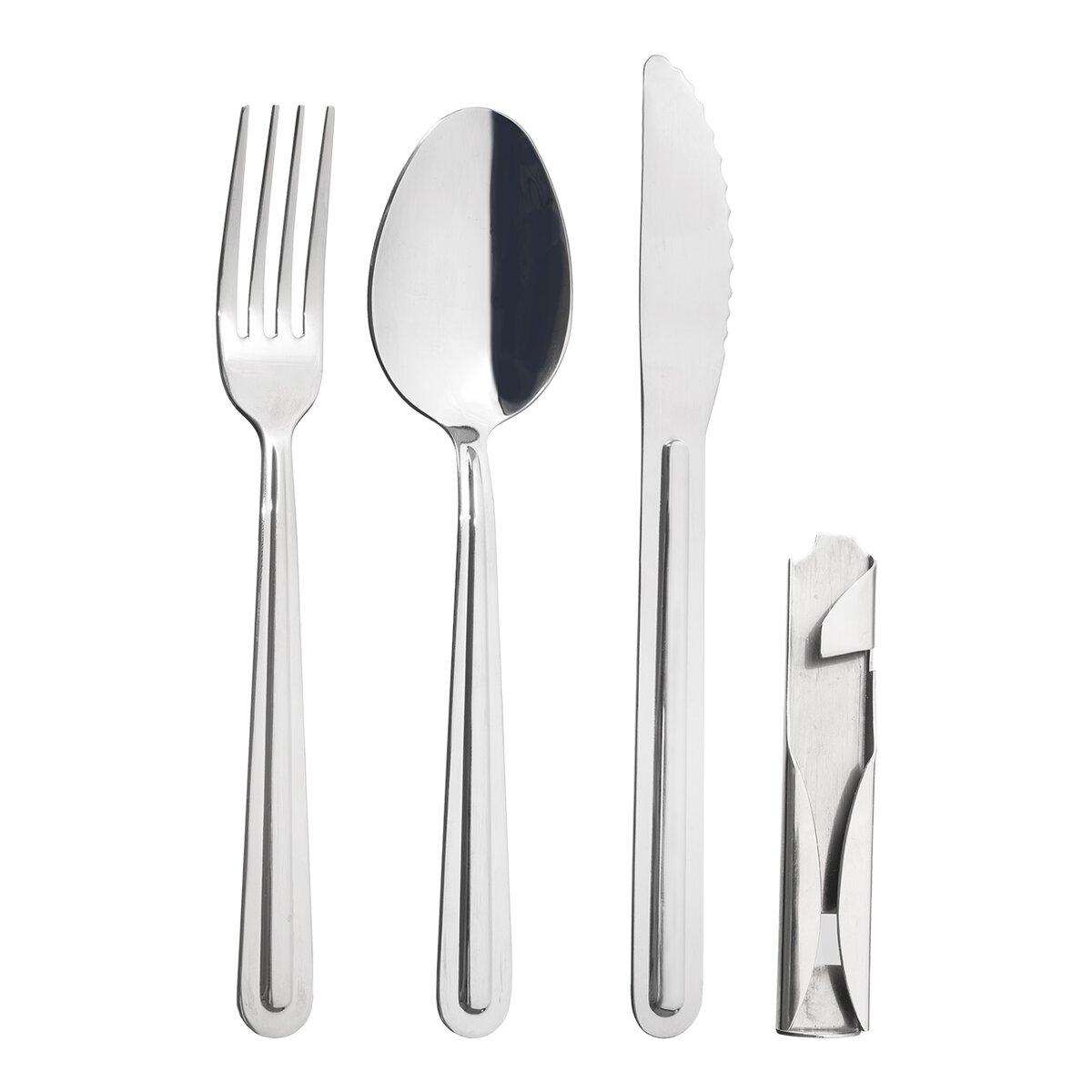 Viac informáciíNa dovolenke, v kempe, karavane, na tábore aj pri cestovaní je šikovná nerezová sada príborov vďačným pomocníkom. Lyžica, vidlička a nôž sú uložené v držadle, ktoré slúžia zároveň ako otvárač korunkových uzáverov a konzerv. Stačí z neho príbory vytiahnuť a máte plnohodnotnú sadu pre 1 stravníka. Sadu oceníte napríklad aj na chalupe alebo na študentskom internáte.