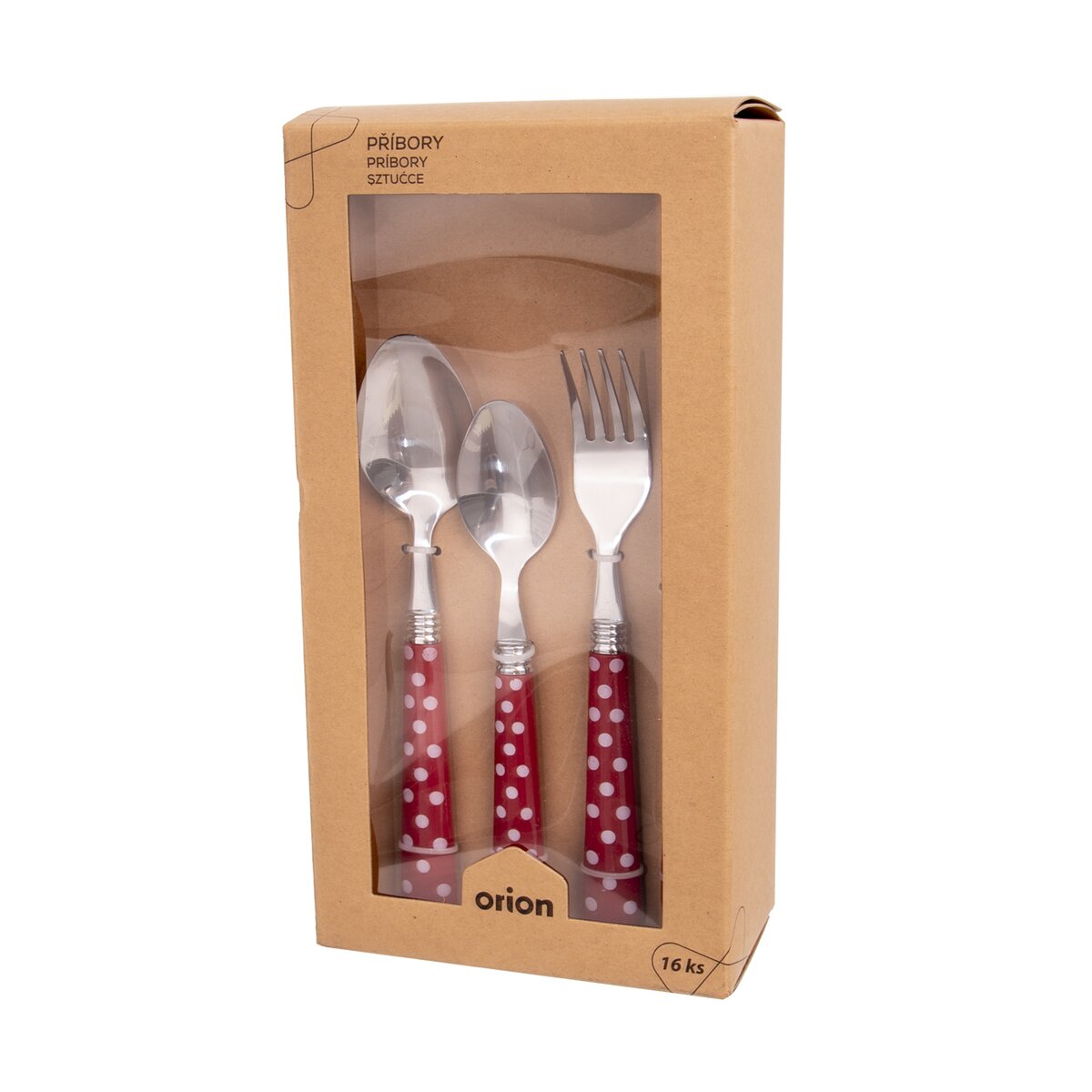 Kód produktu 143667Kvalitné nerezové príbory s plastovou rukoväťou s dekorom bodiek, pre každodenné používanie doma, na chalupe aj na dovolenke v kempe, karavane.