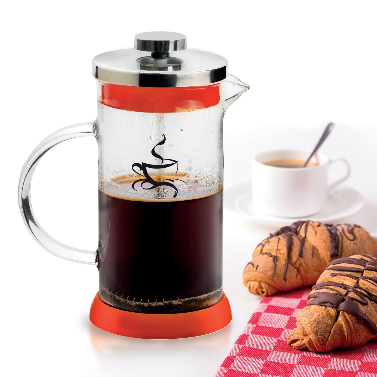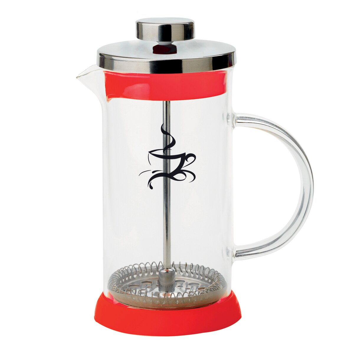 Kanvica so sitkom ľahko a rýchlo pripraví kávu bez usadeniny alebo sypaný čaj bez lístkov či kvetov. Pomocou jemného sitka stlačíte pevné čiastočky z nápoja na dno kanvice. Je ale tiež skvelá pre prípravu ľadovej kávy s hustou penou (len voda, instantná káva, prípadne cukor alebo med a napeníte). Výborne napení teplé mlieko do kávy alebo detské kakao alebo caro. Jednoduchá manipulácia, jednoduché čistenie, vďaka silikónu nekĺže po podložke. Materiál: sklo (odolné teplotám do 180 ° C, ale nie je varné sklo!), Plast, silikón, nerez. Farba červená. Rozmery: objem 0,35 l, pr. 7 cm, v. 15,5 cm.