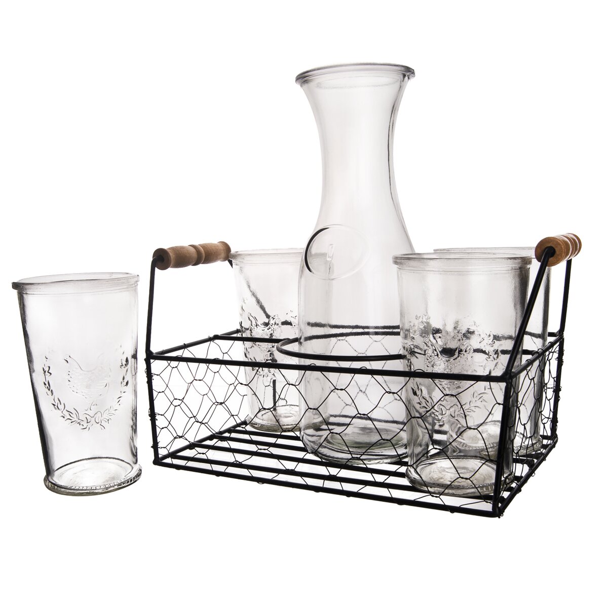 Sada karafy a pohárov v stojane s uchami sa skvele hodí pre servírovanie osviežujúcich nápojov na terasu, záhradu i doma. Materiál: sklo, kov, drevo. Rozmery: karafa 1 l, pr. 10,5 cm, v. 25,5 cm, poháre pr. 8 cm, v. 14,5 cm, stojan 25x17 cm.