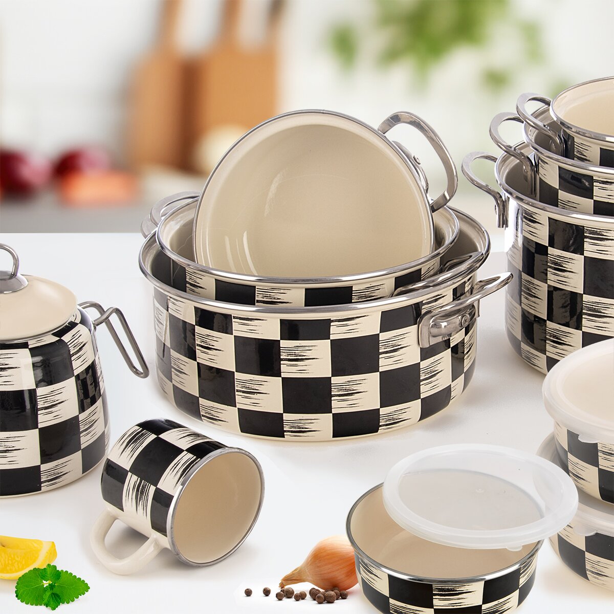 Viac informáciíDizajnová kolekcia ŠACHOVNICA zahŕňa zaujímavé smaltované kúsky, ktoré majú dlhú životnosť a výrazný dizajn, ktorý osvieži mnohokrát monochromatické kuchyne a jedálne. Sú to štýlové kúsky, ktoré neprehliadnete.
