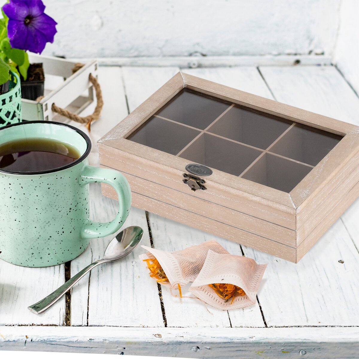 Viac informáciíZákladom pitného režimu je čistá voda. A čaj je hneď na druhom mieste v obľúbenosti pitia. Preto sa Vám bude určite hodiť šikovná drevená kazeta so šiestimi sekciami, do ktorých môžete prehľadne vložiť čajové vrecúška podľa druhov.