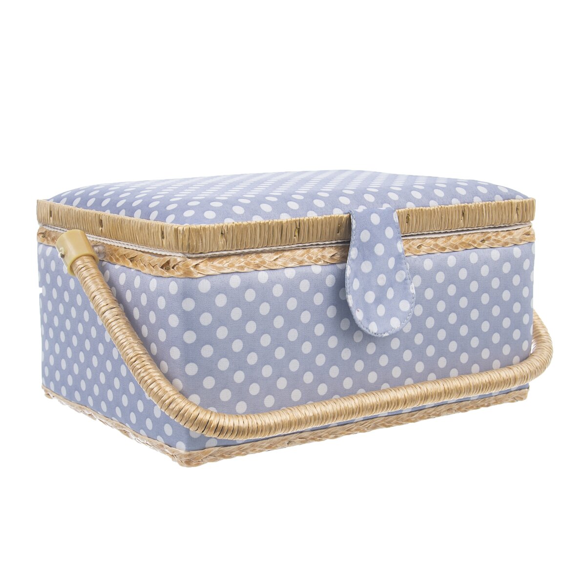 Kód produktu 154022Čalúnená modrá kazeta s bodkami veľkosti 24x18x13 cm, uzavretá vekom a držadlom na prenášanie. Je vhodná na prehľadné uloženie šijacích potrieb, vybavená ihelníčkom a plastovým odnímateľným poschodím s priehradkami