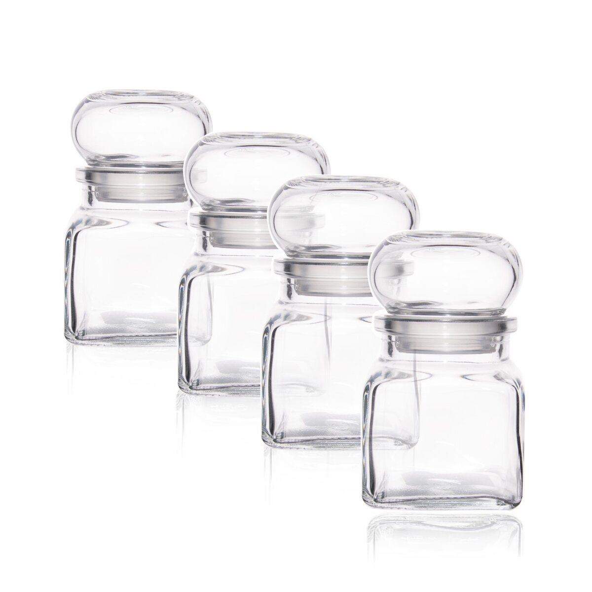 Kód produktu 153557Sada 4 hranatých sklenených koreničiek s viečkom objem 120 ml na uloženie korenia, byliniek, dochucovadiel.