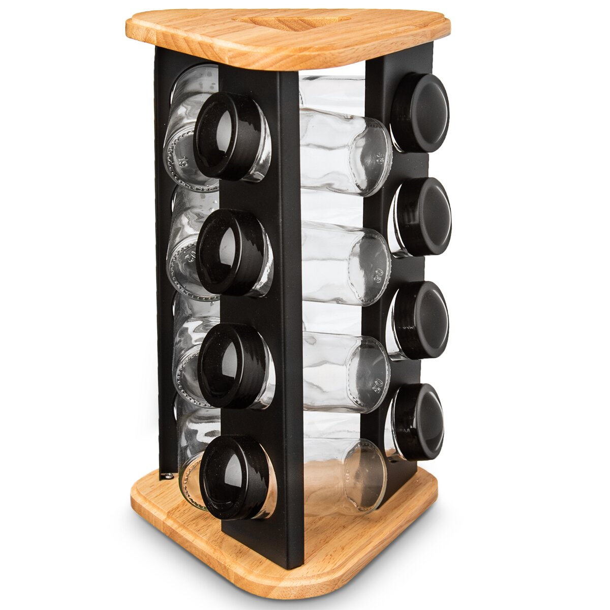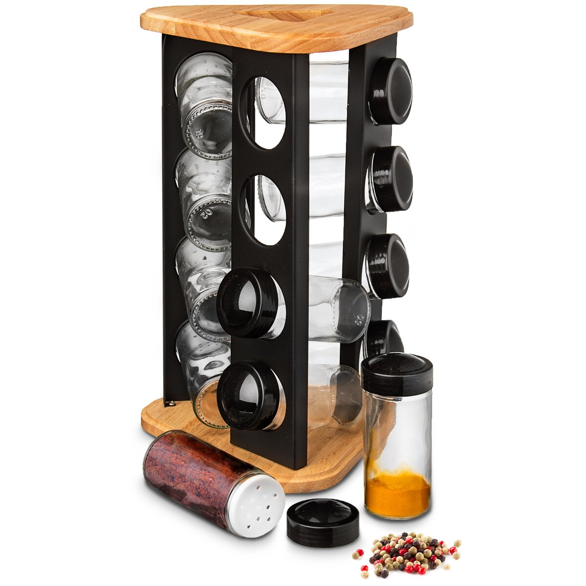 Viac informáciíDizajnový otočný drevený stojan na trojuholníkovej základni v rozmere 18x18x18 cm s čiernymi nerezovými lištami s otvormi, ktorého súčasťou je 12 kusov sklenených koreničiek priemerom 4,5 cm a výšky 10 cm. Každá má plastové sypátko a čierne viečko z PE. Podľa vloženého korenia alebo dochucovadla tak môžete sypátko ponechať alebo ho dáte dole a pohodlne nasypete a vysypete väčšie kúsky, napr. nové korenie, klinčeky.