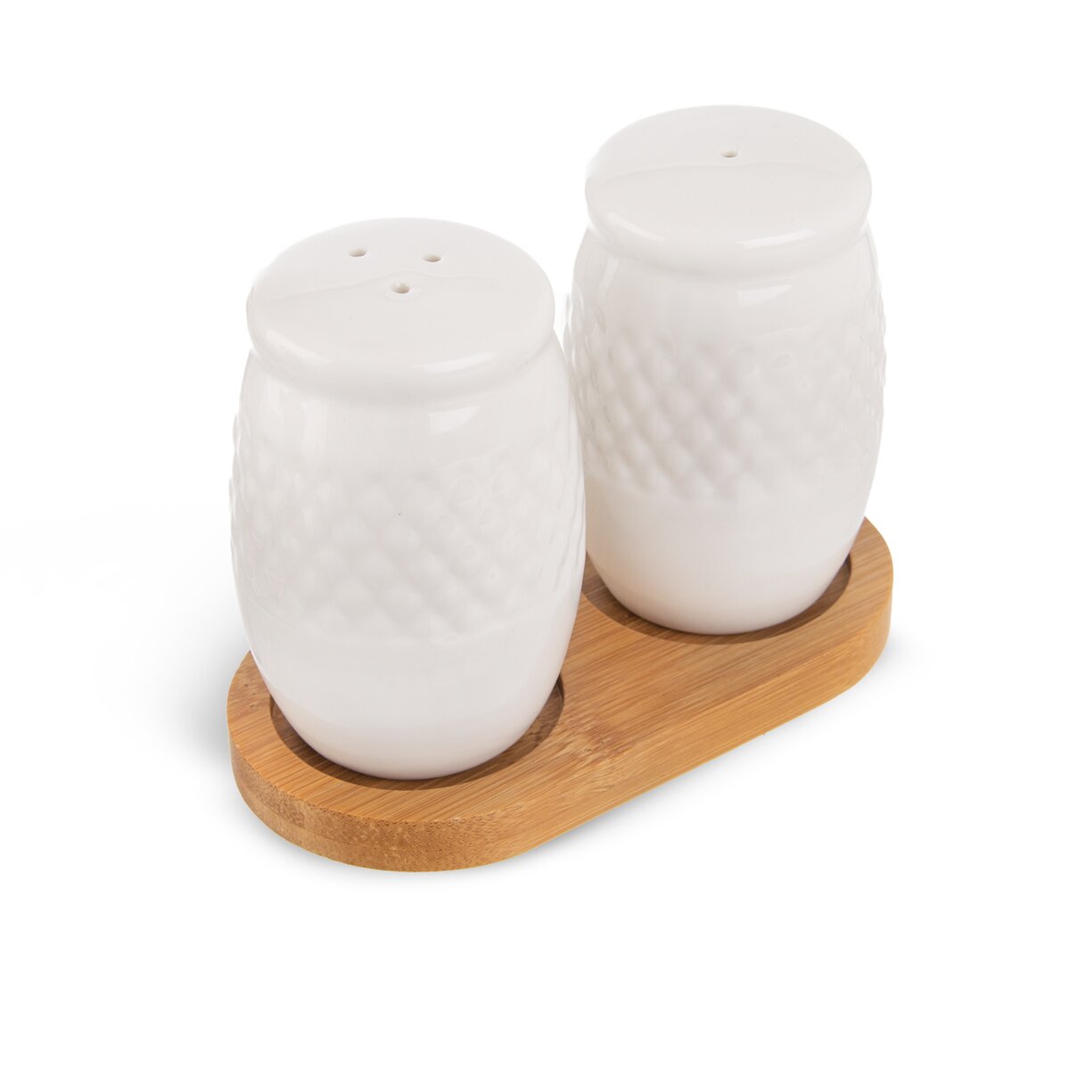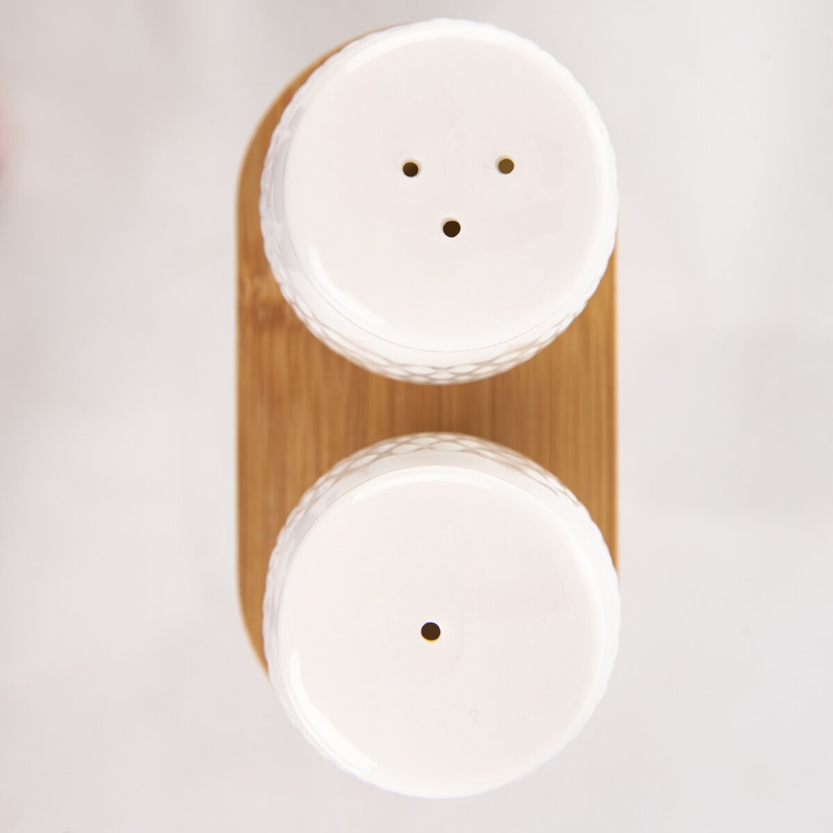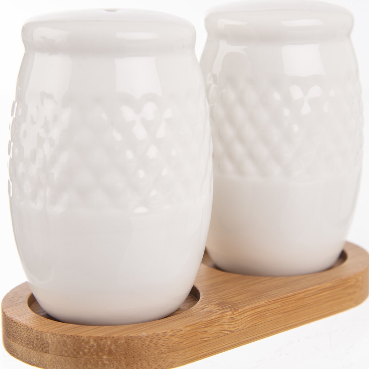 Kód produktu 153669Dochucovacia súprava WHITELINE sa skladá z dreveného stojana s rozmermi 11,5×6×8,5 cm a dvoch porcelánových koreničiek. Tie majú priemer 4,5 cm a po obvode plastické zdobenie.