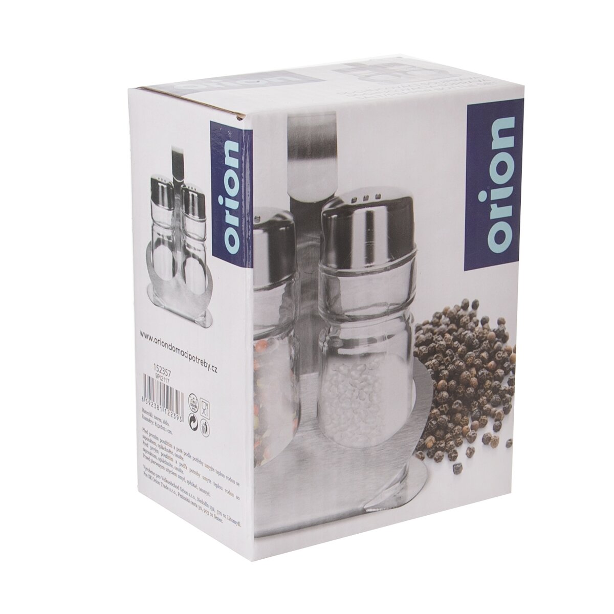 Kód produktu 152357Dochucovacia sada obsahujúca nerezový stojan s rozmermi 8,5×6×11 cm a dve sklenené koreničky s nerezovými uzávermi.