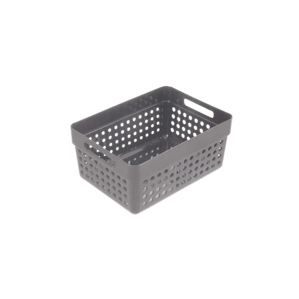 Kód produktu 731641Plastový malý košík v šedej farbe má veľkosť 15,5x11,5x7,3 cm a hodí sa na uloženie koreničiek, kancelárskych potrieb i drobnej kozmetiky.