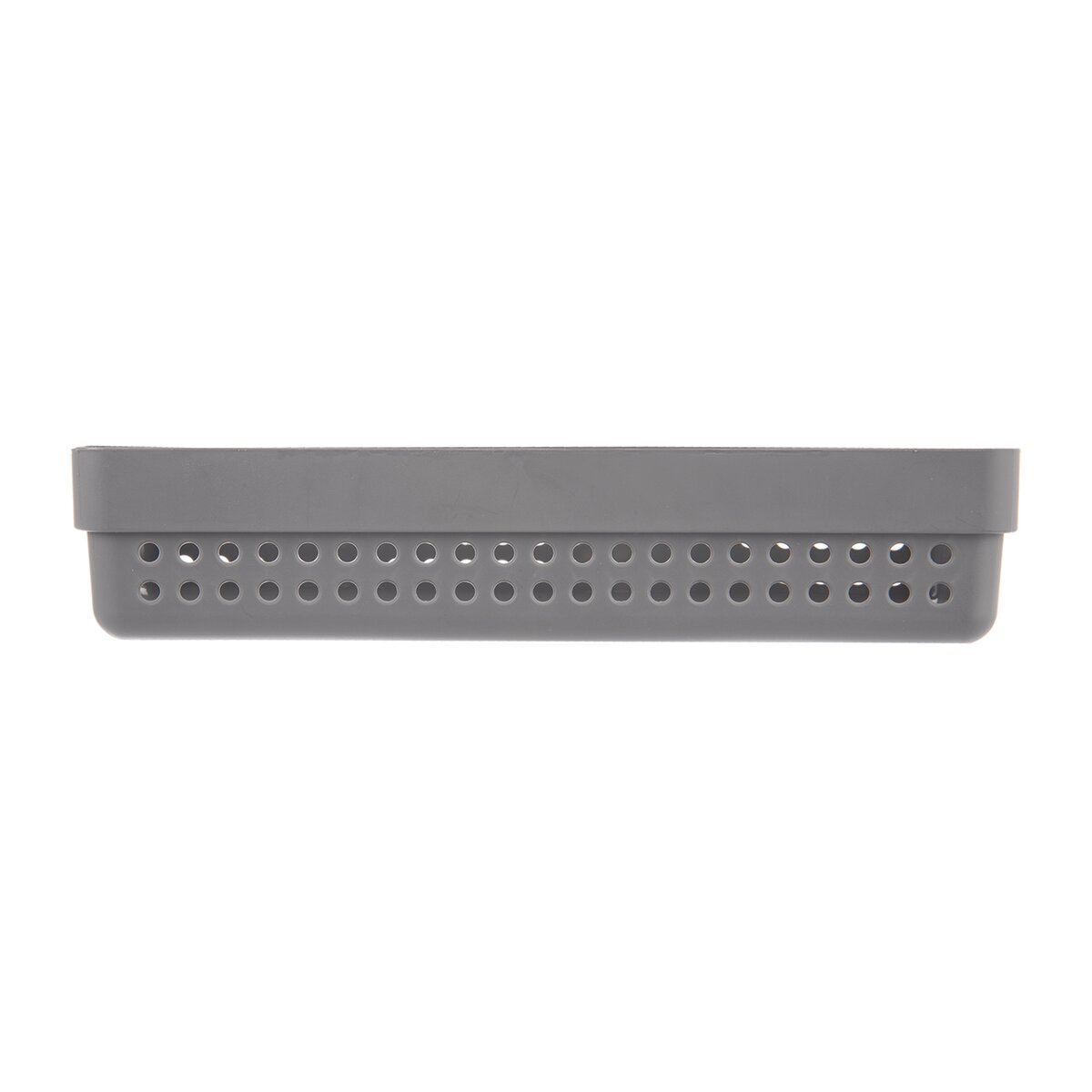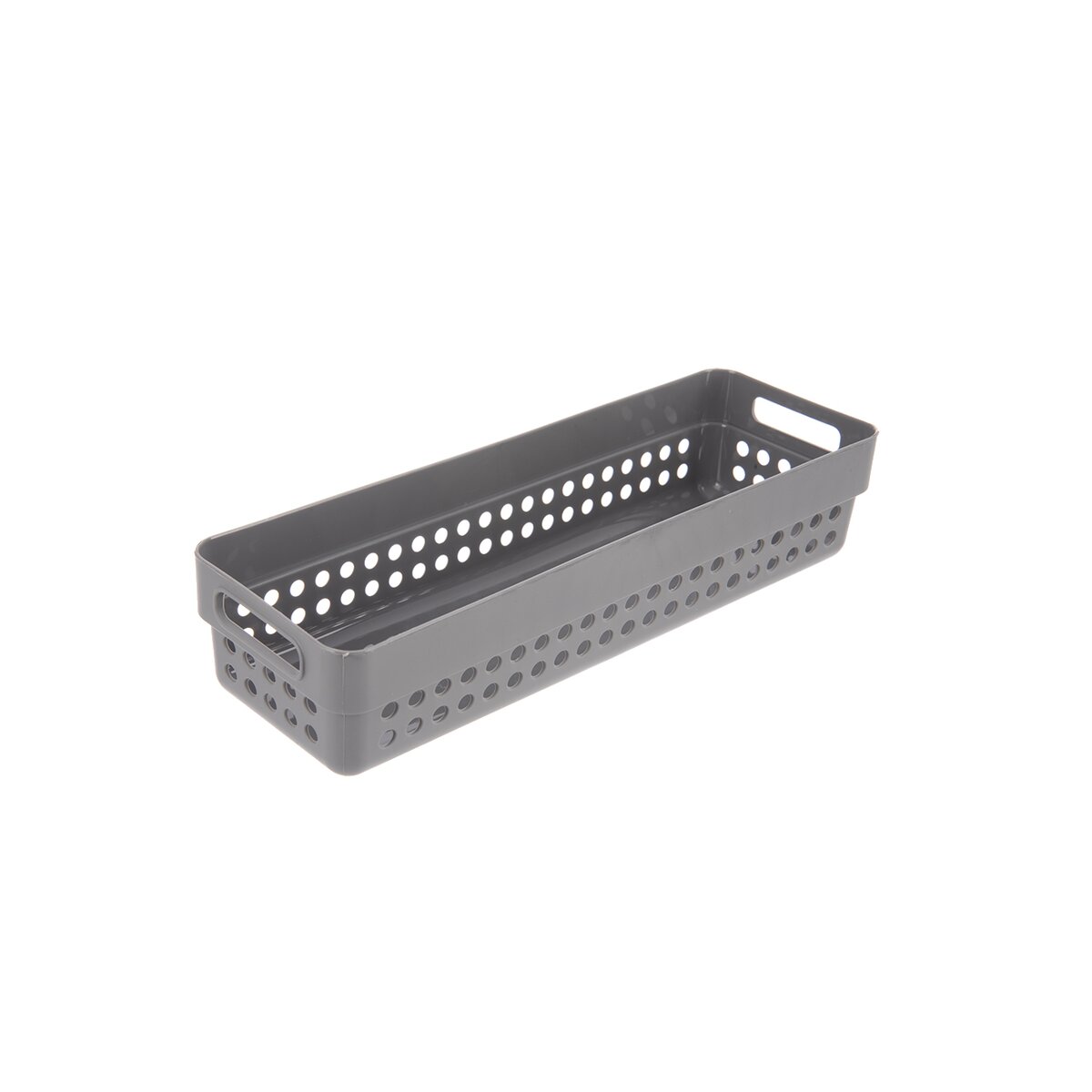 Kód produktu 731639Plastový podlhovastý košík v šedej farbe má veľkosť 23,5x7,5x5 cm a hodí sa na uloženie koreničiek, príborov, písacích potrieb i drobnej kozmetiky.