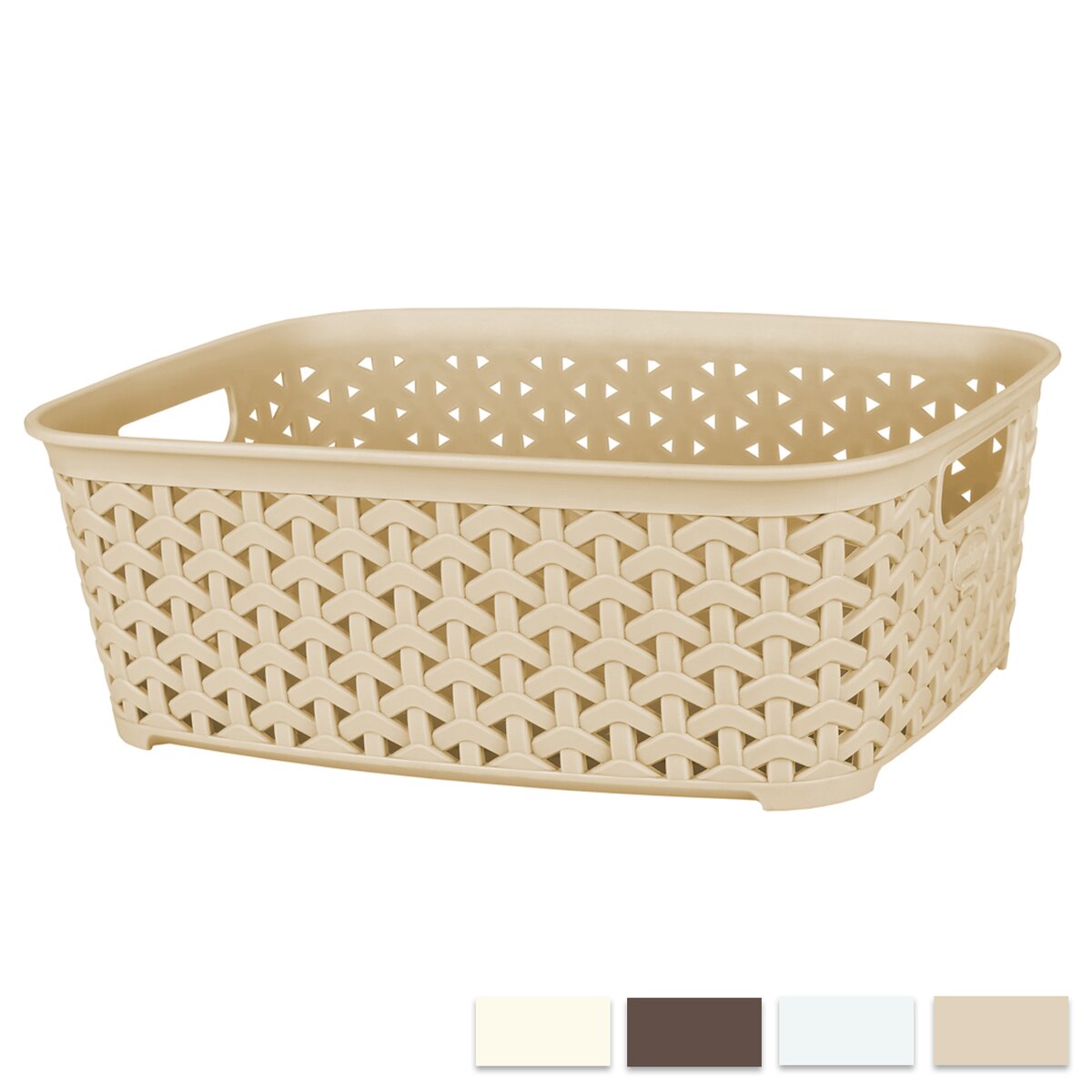 Košík s uchami s dekórom ratanu. Materiál: plast. Farebný assort - biela, hnedá, béžová. Rozmery: 29x21,5x11 cm.