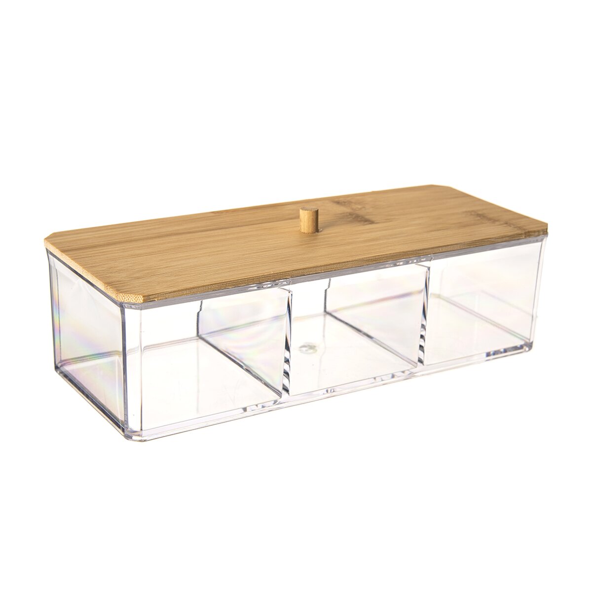 Kód produktu 811252Pozdĺžna plastová transparentná dóza WHITNEY na menšie kozmetické potreby alebo šperky, uzatvárateľná viečkom z bambusového dreva. Má tri priehradky pre lepšiu organizáciu ukladaných drobností.