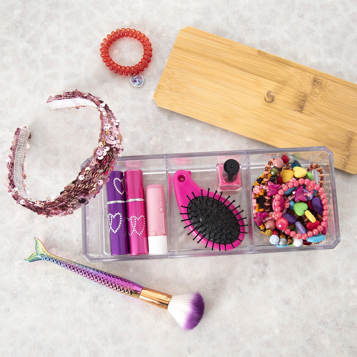 Vďaka nej budete mať svoje kozmetické potreby pekne zorganizované a ihneď po ruke. Je delená dvoma prepážkami, takže si môžete drobnosti, od tieňov na oči, rúžu až po prstienky pekne usporiadať do troch sekcií. Malé parádnice si do nej v izbičke môžu uložiť detské laky na nechty, korálky alebo náramky.