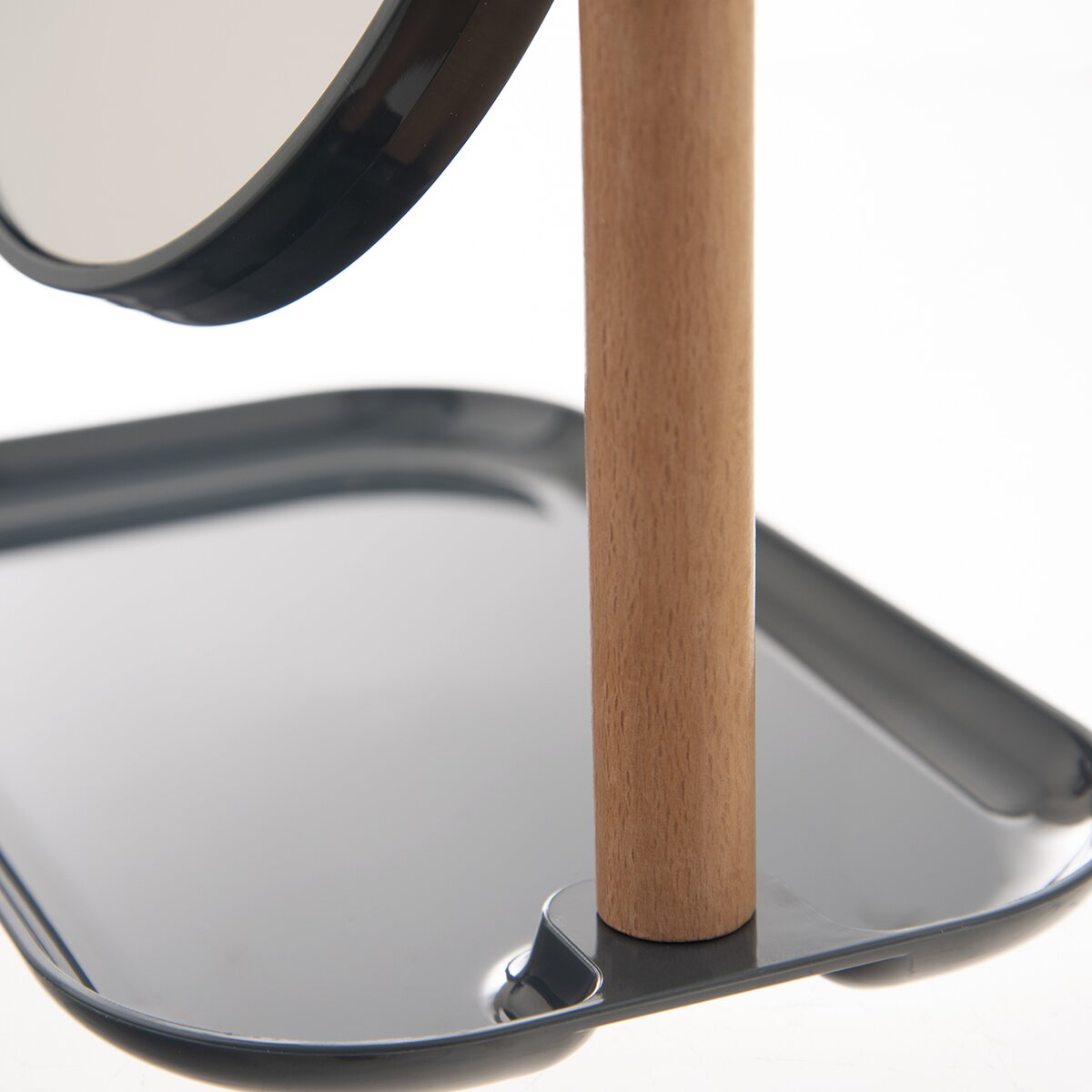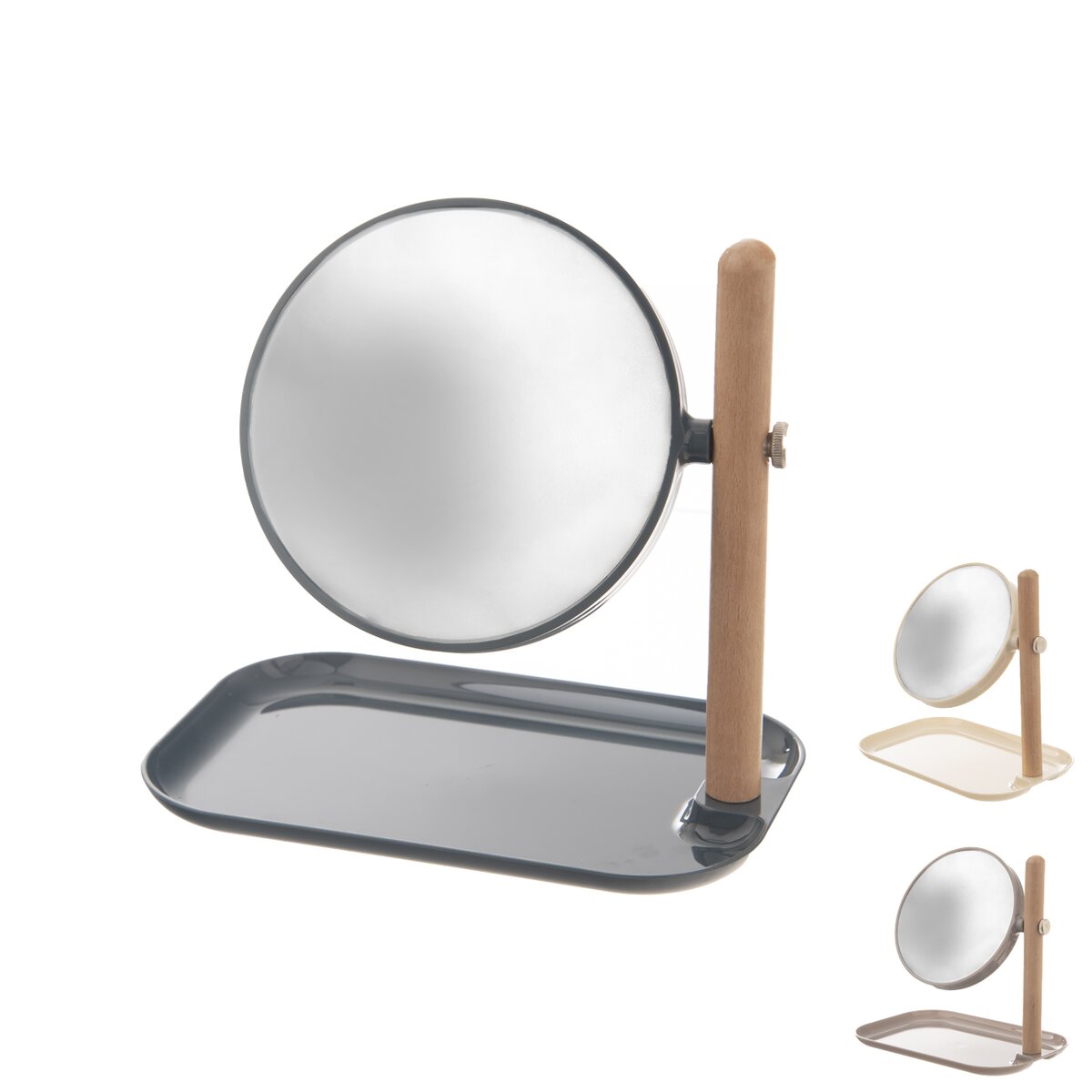 Kód produktu 510151Obojstranné stolné zrkadlo okrúhleho tvaru, doplnené odkladacím priestorom a uchytené na drevenom stojane. Druhá strana zväčšuje obraz, takže umožní dokonalé líčenie alebo odličovanie.