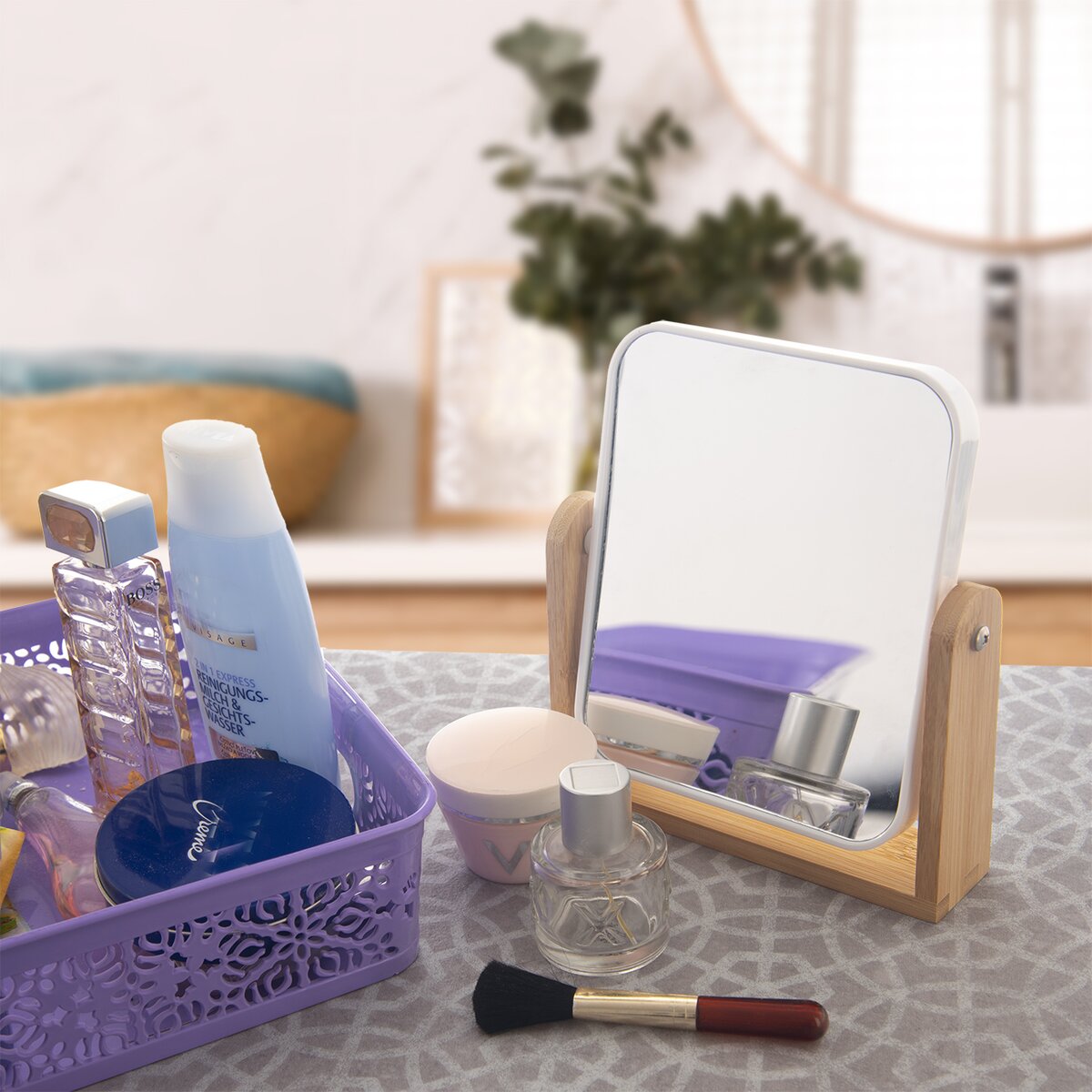 Kód produktu 510150Obojstranné zrkadlo WHITNEY v oválnom alebo hranatom prevedení, uložené v bambusovom stojane. Druhá strana zväčšuje obraz, takže umožní dokonalé líčenie alebo odličovanie.