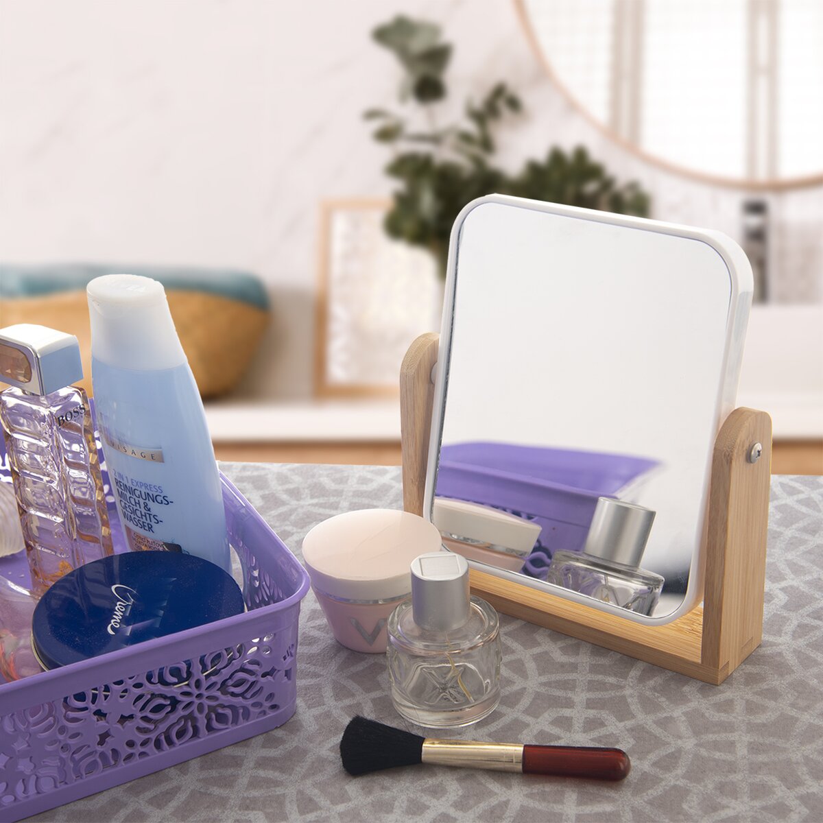 Upravená tvár a primeraný make-up je vizitkou každej ženy. Aby bolo líčenie očí, úprava obočia rovnomerné, presne podľa vašich predstáv, umožní šikovné stolné zrkadlo z plastu PS a skla, uložené na kovových skrutkách v elegantnom bambusovom stojane.