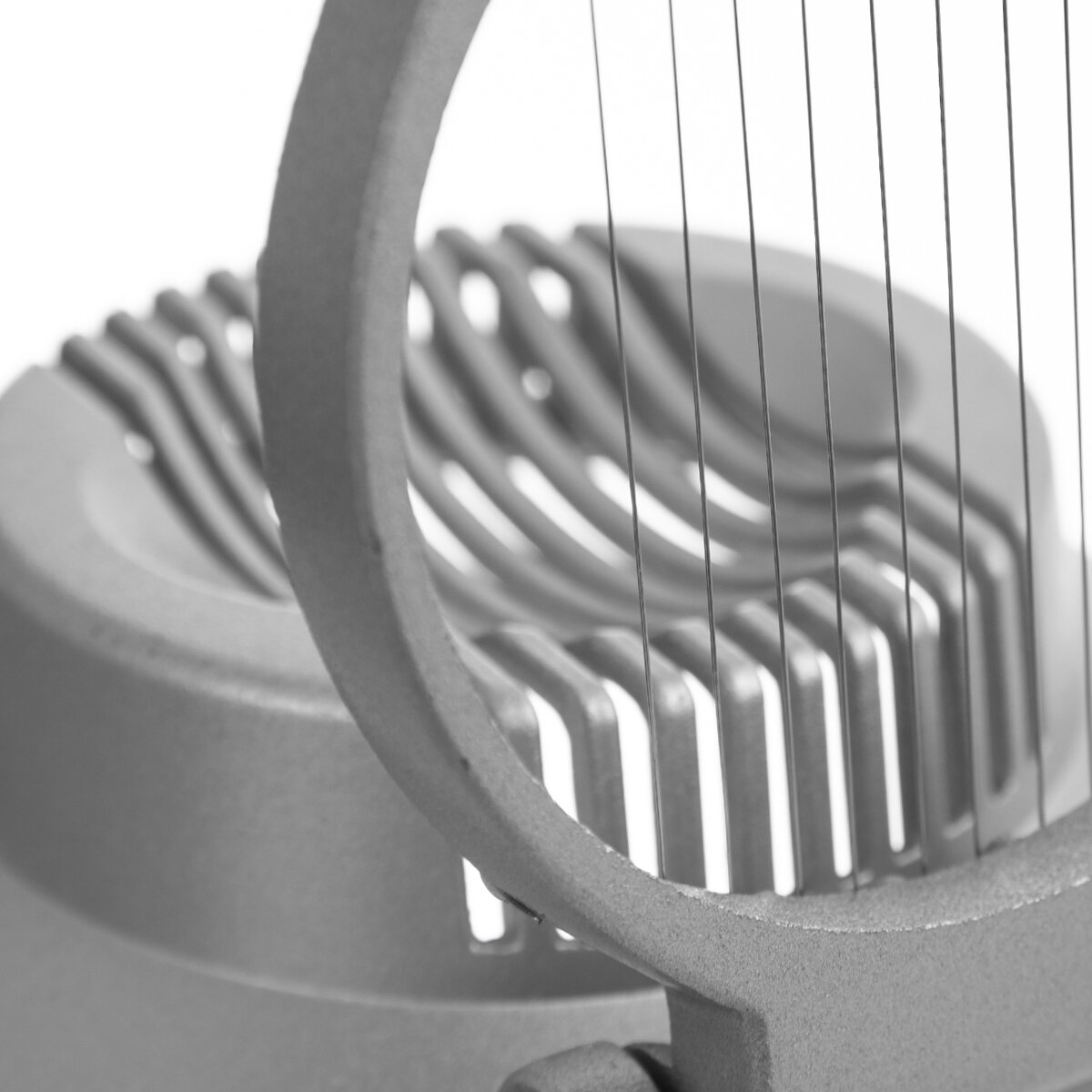 Stačí len zdvihnúť hornú časť s vodorovne natiahnutými strunami, olúpané vajíčko položiť do priehlbiny a zatlačiť.
