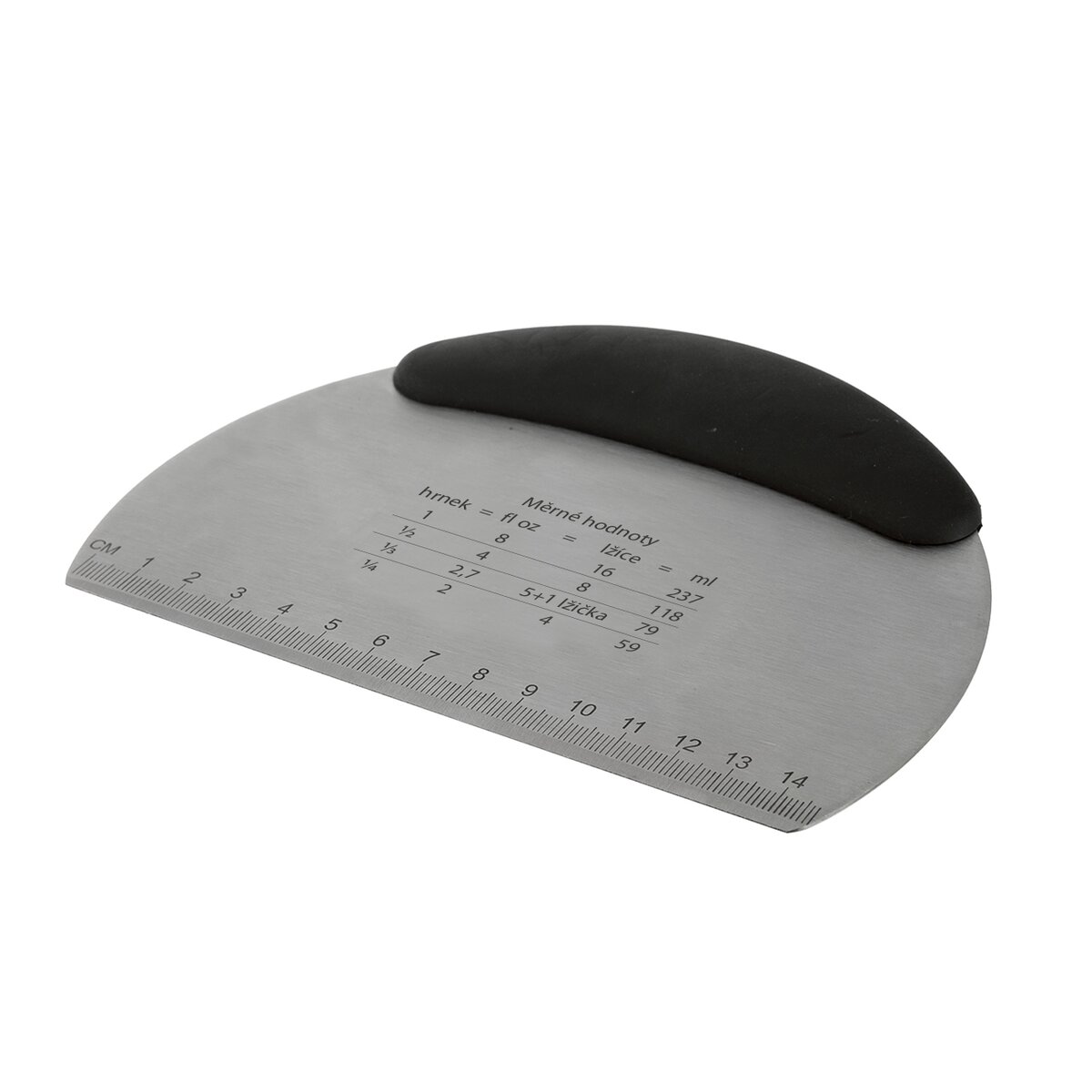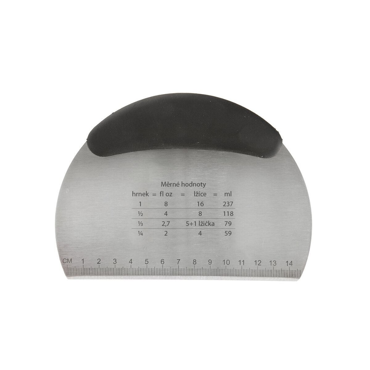 Na hrane sú navyše vyznačené jednotky dĺžky v cm (0 až 14,7 cm), a v ploche je aj šikovná tabuľka, uľahčujúca prevody merných jednotiek (hrnček-fl oz-lyžica-ml).