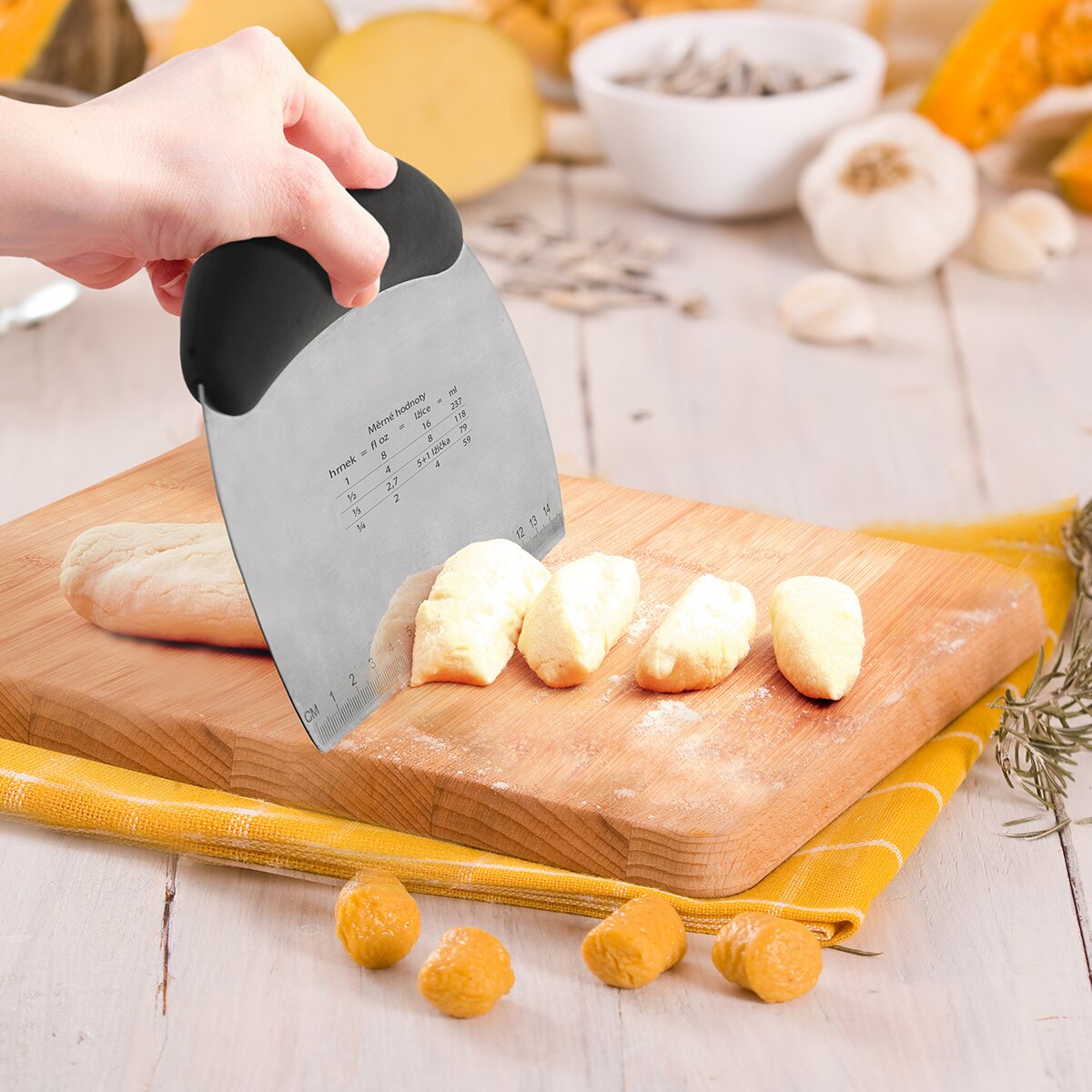 A keď varíte zemiakové halušky, stačí cesto vyváľať, hranou špachtle nakrájať, ľahko nabrať a vhodiť do vriacej vody. Tiež halušky a rôzne závarky do polievok pretáčate cez sito do vývaru alebo vody. Vďaka gumovej rukoväti z TPR gumy a PP plastu veľmi dobre padne do ruky.