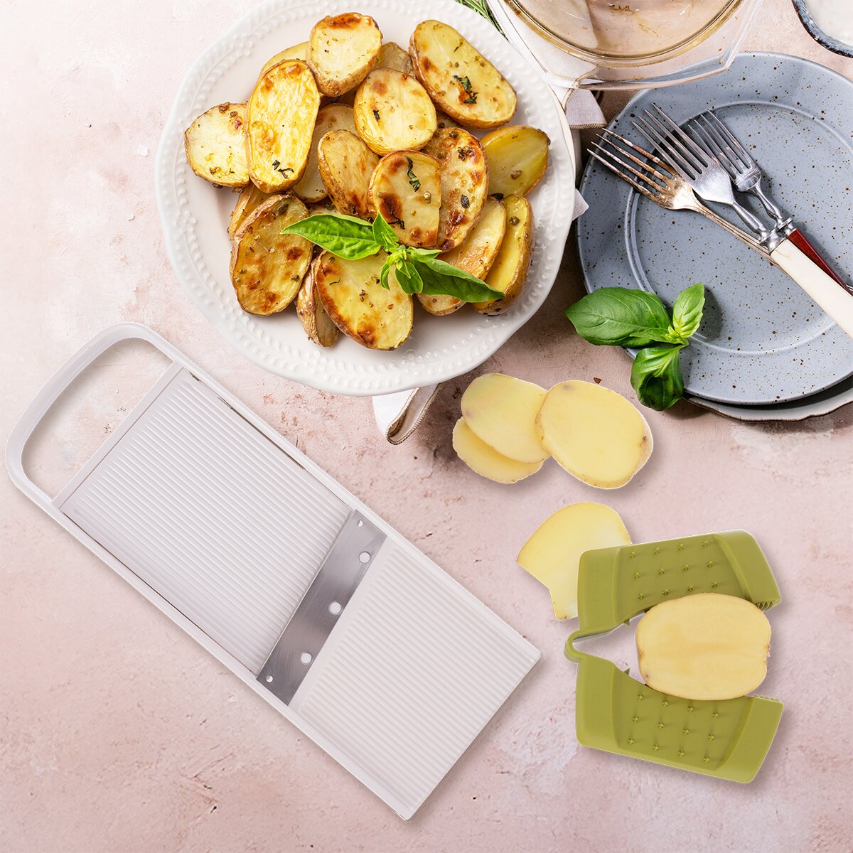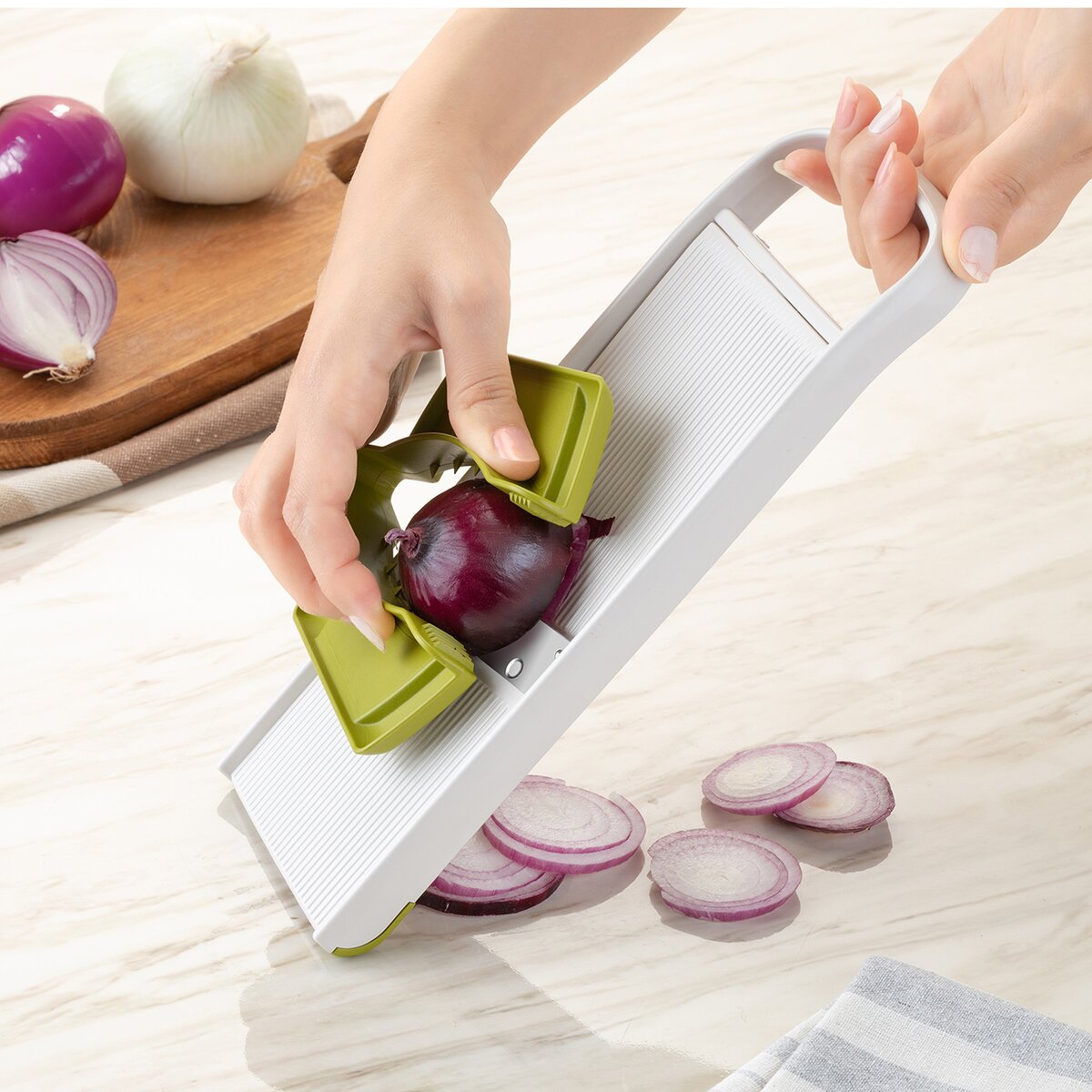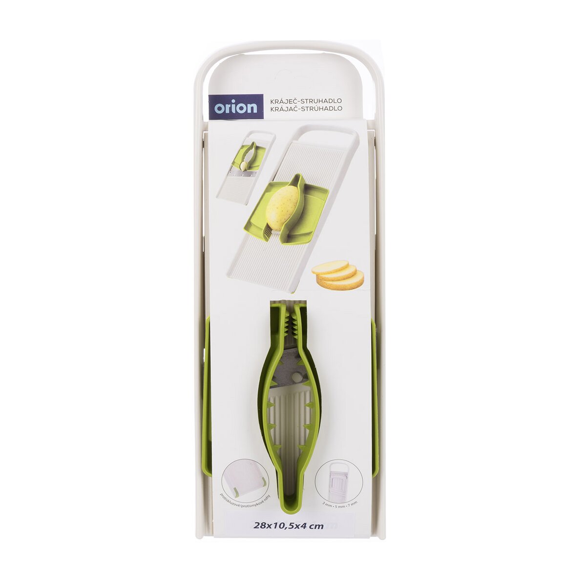 Kód produktu 144716Krájač-strúhadlo s vodiacim držiakom je praktickým pomocníkom pre rýchle a bezpečné krájanie a strúhanie potravín. Umožňuje nastavenie hrúbky plátkov v troch stupňoch – 3, 5 a 7 mm – podľa potreby a typu suroviny. Krájač je vybavený držiakom proti poraneniu so špeciálnymi hrotmi, ktoré zaisťujú pevné uchytenie potravín počas práce a umožňujú bezpečnú manipuláciu aj s malými surovinami, napríklad cesnakom. Pre väčšiu stabilitu pri použití obsahuje prístroj dva protišmykové rohy, ktoré zabraňujú nežiaducemu posunu krájača počas krájania či strúhania, a zaisťujú tak pohodlnú a bezpečnú prácu v kuchyni. Výrobok je BPA-free. Materiál: plast ABS + plast PP (držiak) + nerezová oceľ 301 + EVA (anti slip rohy). Rozmery: 28x10,5x4 cm. Možno umývať v umývačke.