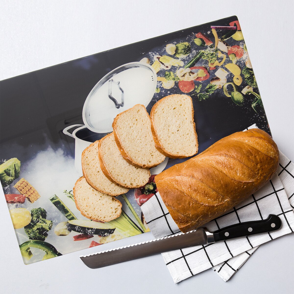 Viac informáciíPodložka na krájanie z tvrdeného skla v kuchyni slúži nielen na krájanie potravín. Môžete ju skvele využiť aj ako kryt časti varnej dosky, tým získate väčšiu pracovnú plochu v malých kuchyniach, alebo ju umiestniť pri varení za varnú dosku a zabrániť tak ušpineniu steny.