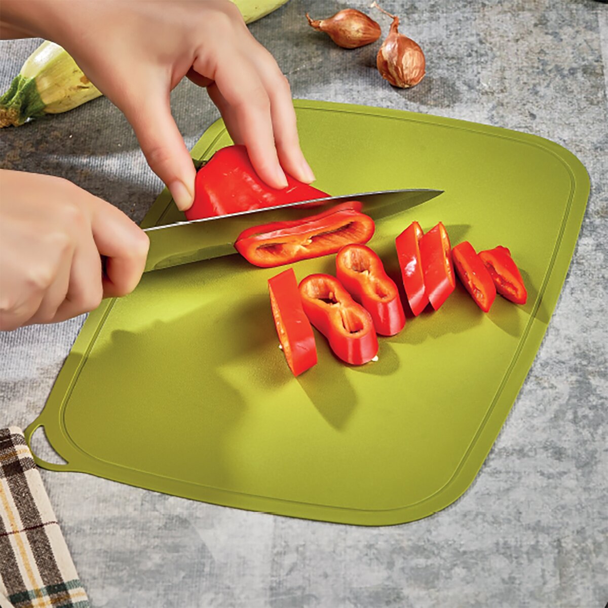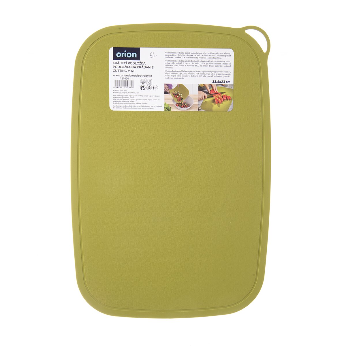 Kód produktu 121424Plastová zelená krájacia podložka rozmeru 33,5x23 cm je vhodná na krájanie najrôznejších potravín, ich zosypávanie do misy či hrnca a opatrená šikovnou drážkou po obvode.