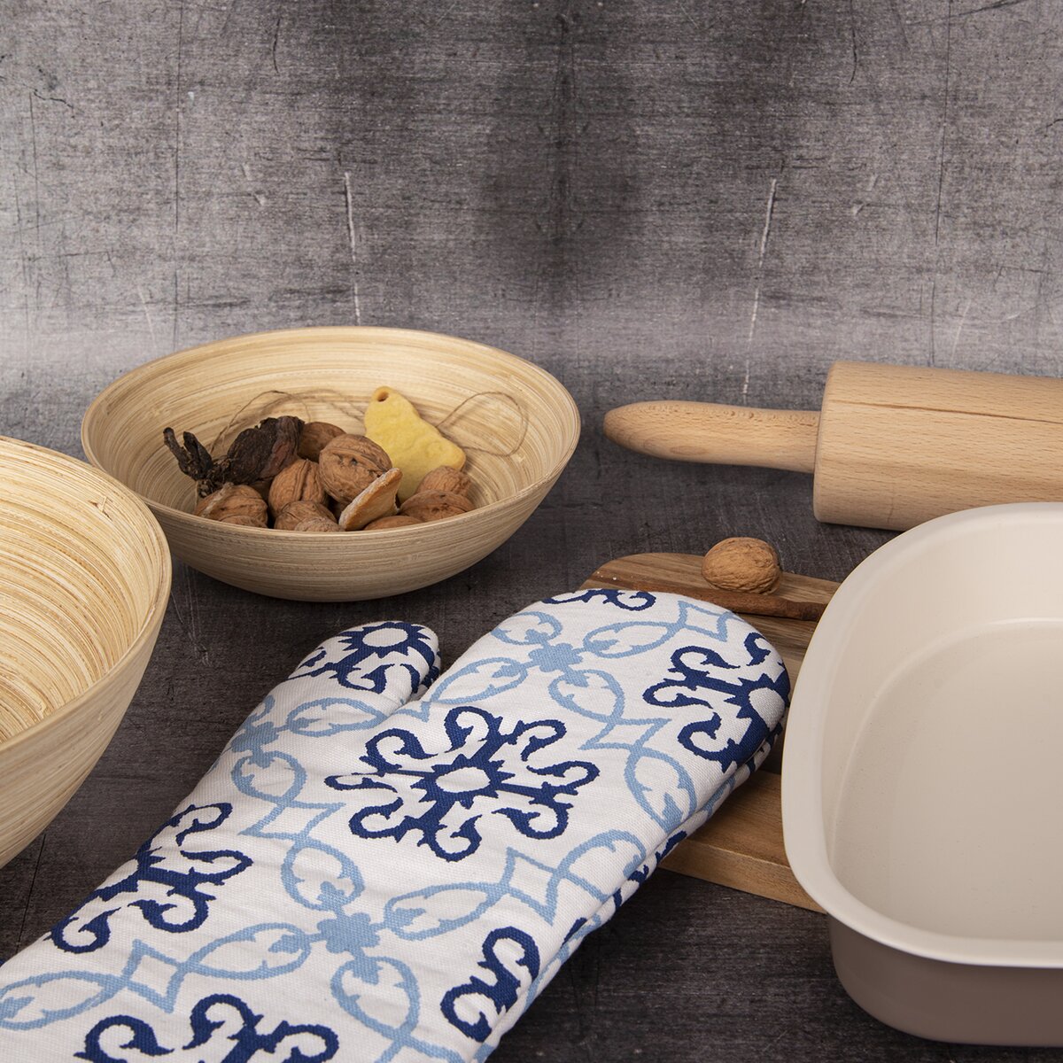 Aj kuchynská chňapka môže byť štýlová. To potvrdzuje táto bavlnená rukavica s modrými ornamentmi, ktorá vynikne v každej kuchyni. Uľahčí manipuláciu s horúcim riadom a vďaka svojej predĺženej dĺžke 31 cm ochráni pred popálením vaše zápästie a časť predlaktia. Ladiace pútko umožňuje pohodlné zavesenie.