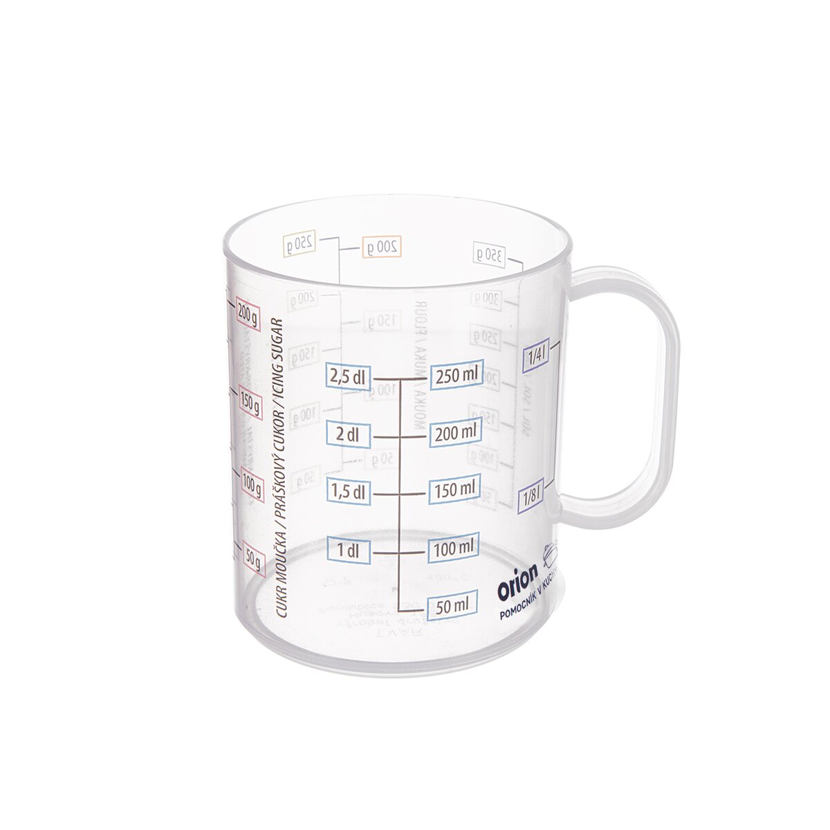 Kód produktu 120558Plastová kuchynská odmerka s objemom 0,25 la s uchom je určená na meranie množstva sypkých i tekutých surovín pri varení či pečení. Odmerná stupnica má značenie v ml, dl, l a g pre vybrané potraviny.