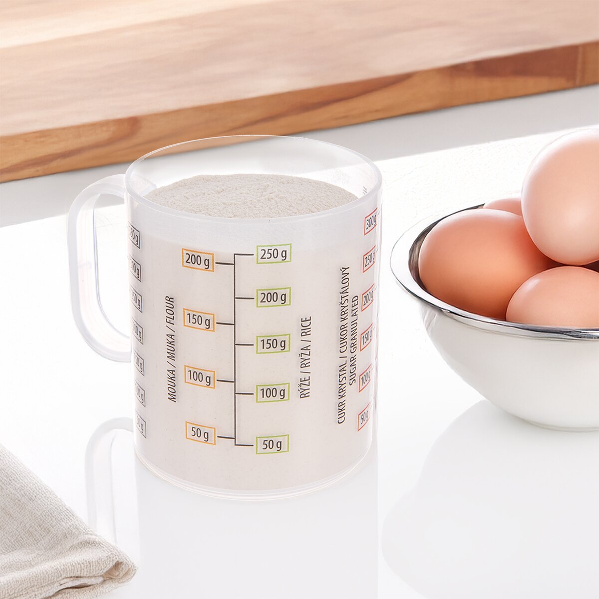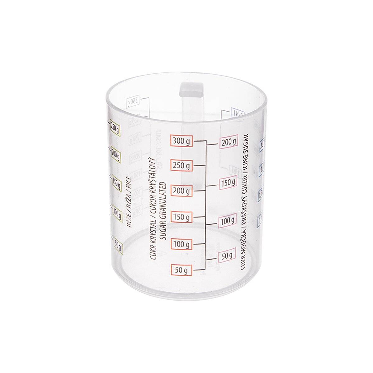 Je ideálna na odmeriavanie surovín, ako je soľ, múka, ryža, cukor kryštál, cukor múčka aj rôzne tekuté zložky. Vďaka praktickému prevedeniu a držadlu je spoľahlivým pomocníkom pri každodennej príprave pokrmov. Je vyrobená z pevného plastu PP, je možné ju umývať v umývačke riadu.