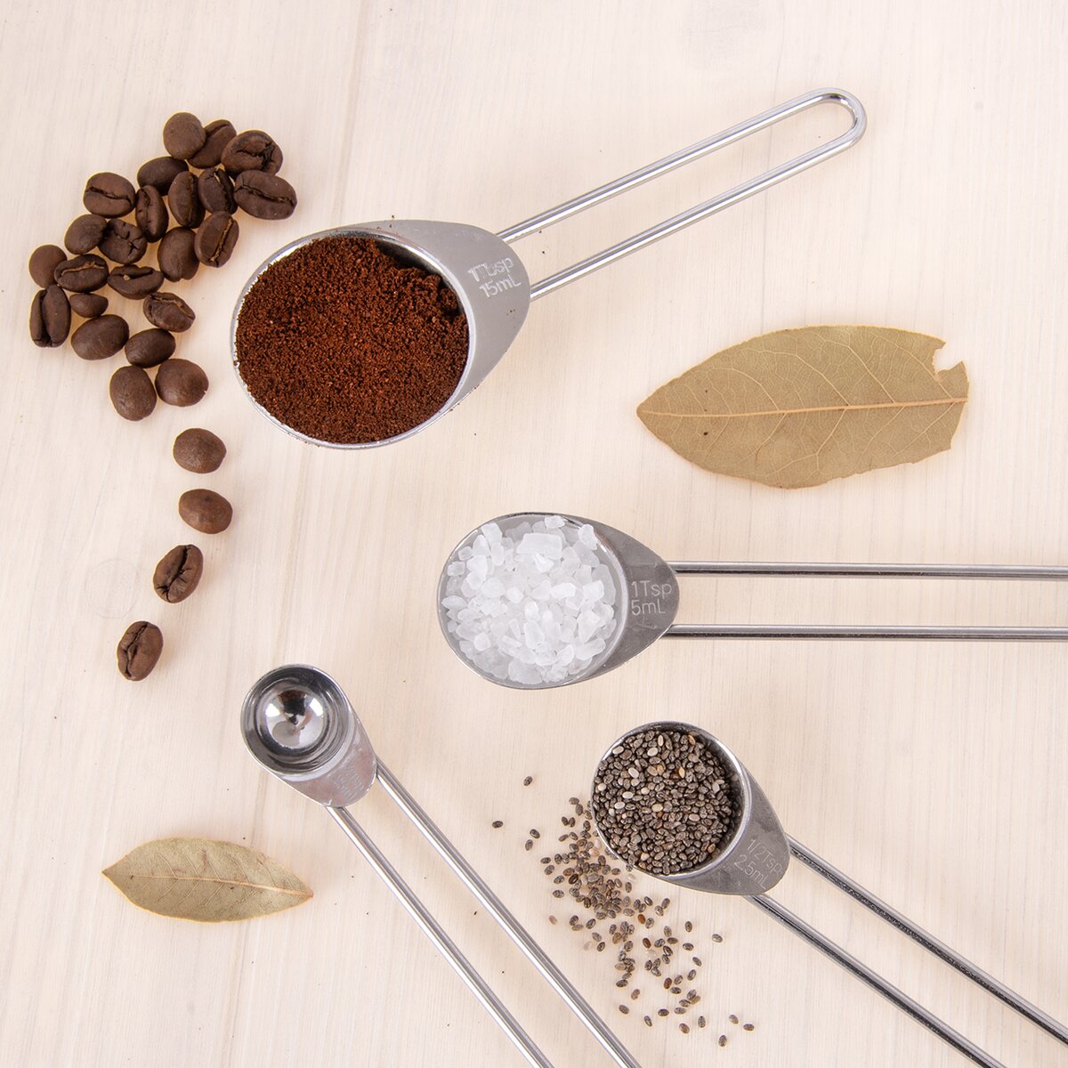 Sú vyrobené z nerezu a zavesené na krúžku, navyše do seba zapadajú. Hodí sa na odmeriavanie kypriaceho prášku, sódy, sušeného droždia, mletej kávy, vanilkového extraktu, korenia a rôznych dochucovadiel.